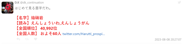 根據網友資料查詢,「焔硝岩」這個姓氏在日本排名約 4 萬多位,全國約 60 個人擁有這個姓氏,真的是...百萬中選一都不為過...。