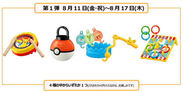 活動分為三彈,三個活動期間會有不同的玩具隨機給購買快樂兒童餐的消費者,第一彈為 8 月 11 日起的第一周,包含 : 祭典皮卡丘太鼓、寶可球燈籠、寶可夢釣魚玩具與祭典套圈圈小玩具。