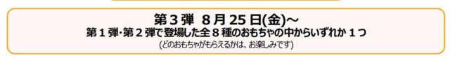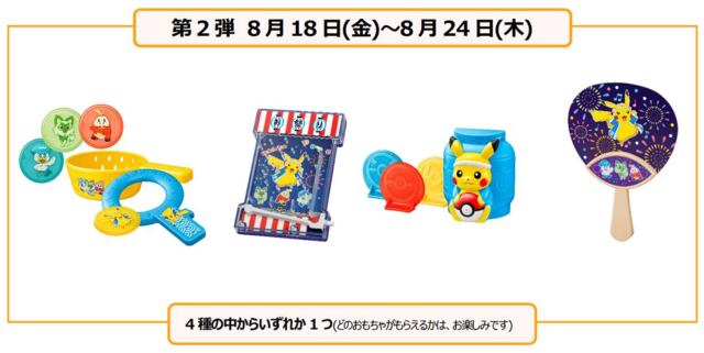 第二彈則是 8 月 18 日起的第二周,玩具贈品包含 : 祭典撈魚小勺子、寶可夢祭典彈珠台、祭典皮卡丘水槍射擊遊戲與原創祭典扇子。