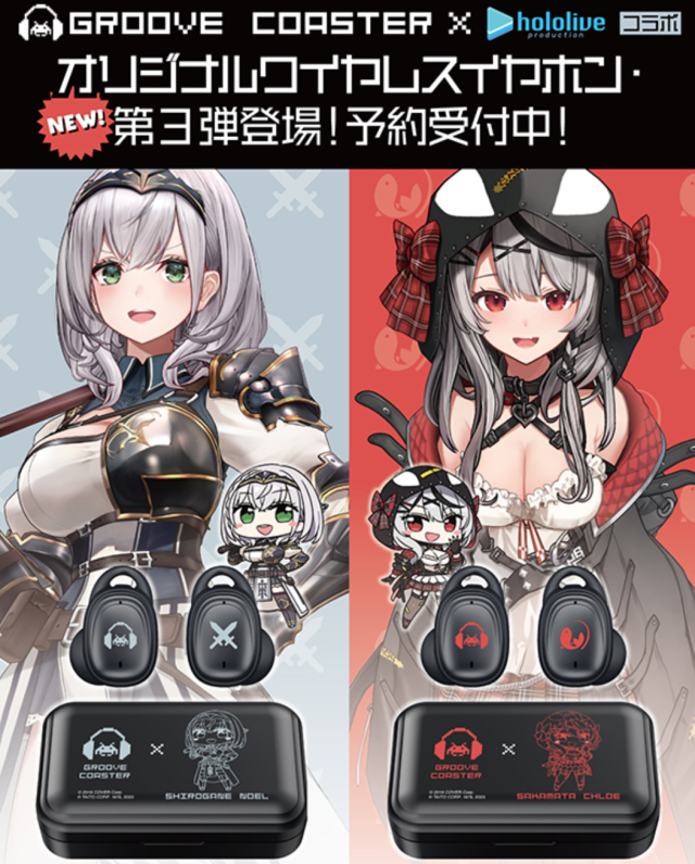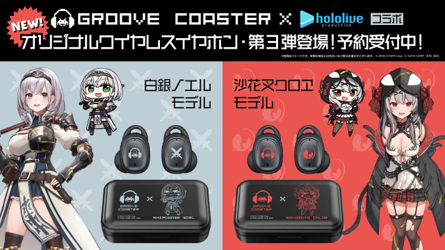 TAITO 推出的音樂遊戲 《Groove Coaster》,在今日 ( 8/10 ) 宣布其 Switch 平台遊戲《Groove Coaster: Wai Wai Party!!!! 》與 Cover 旗下的 VTuber 經紀公司《hololive》合作,推出以白銀諾艾爾 & 沙花叉克蘿耶為藍本設計的藍牙耳機。售價為 11,880 日圓,目前已於各電商平台開放預購。
