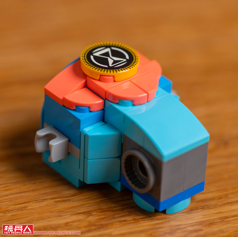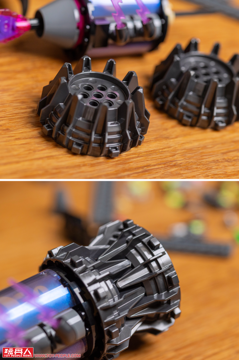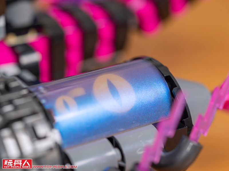 ▼ 接著是小編最喜歡的動力系統部分,運用兩個像是帶刺車輪的零件咬合在一起組成,加上施以亮粉效果的半透明玻璃與眼睛零件,煞氣又誇張的噴射引擎就完成啦。