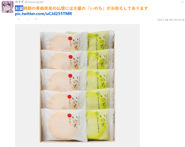 而最近也快到日本的盂蘭盆節 ( 類似我們的清明節,8 月 13 至 16 日 ),青森縣的居民也常在佛壇供奉甜點「いのち」。
