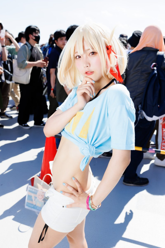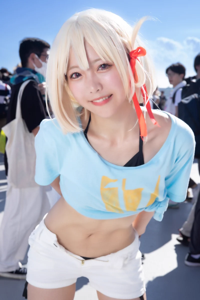 除了 Coser 桃田とろ扮演神曲「強風大背頭」歌愛雪之外,有另一個備受會場關注的 Coser - ニャロメ・ニア ( @nyarome_cos ),她化身《Lycoris Recoil 莉可麗絲》的錦木千束來到會場,以動畫最終話的夏日服裝出角,以可愛面貌讓不少網友大讚 : 「這是二次原本人現身吧 !!!」