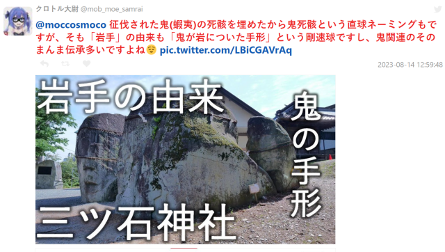 不過也有網友提到,連岩手縣名稱也跟鬼怪有所關聯,傳說很久以前,盛岡北山地區來了三隻「羅剎鬼」,這三隻羅剎鬼經常侵害附近居民,於是向神社的神明祈禱,祈祝能趕走這三隻羅剎鬼。