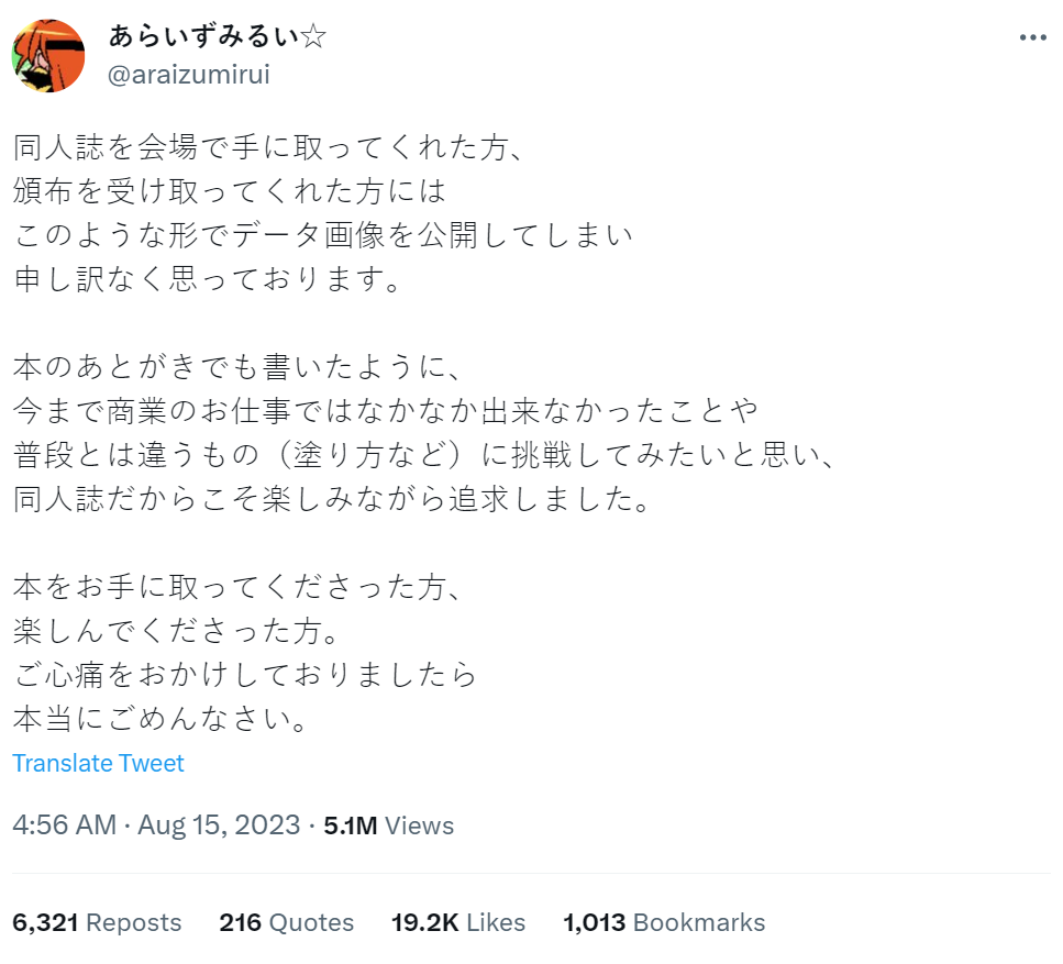 遭受質疑的就是新刊的封面內容,新泉留衣表示對於這次在會場購買新刊的朋友,遇到這樣的質疑感到抱歉。在新刊的後記也有提到,這次的確嘗試了平常商業工作無法使用,不一樣的方式來創作,也因為是同人誌的關係所以希望追求更有趣的方式來繪圖。對於購入書籍的粉絲,不論你是感到快樂還是心痛,都對此感到不好意思。