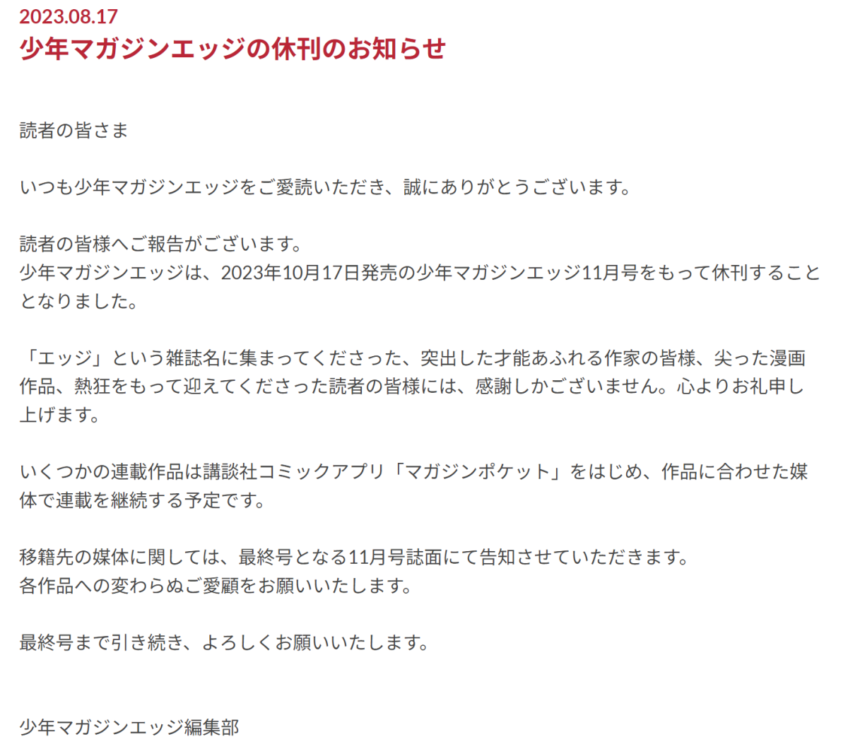 目前官方公告表示向所有月刊名下的所有才華橫溢的作家、前衛的漫畫作品以及所有支持的讀者表示感謝,並確定部分連載作品將繼續在適合該作品的媒體上連載,包含講談社自家的應用程式「マガポケ」 ,未來也會公布月刊內的作品會到何處繼續連載,請希望作品的朋友不要擔心。