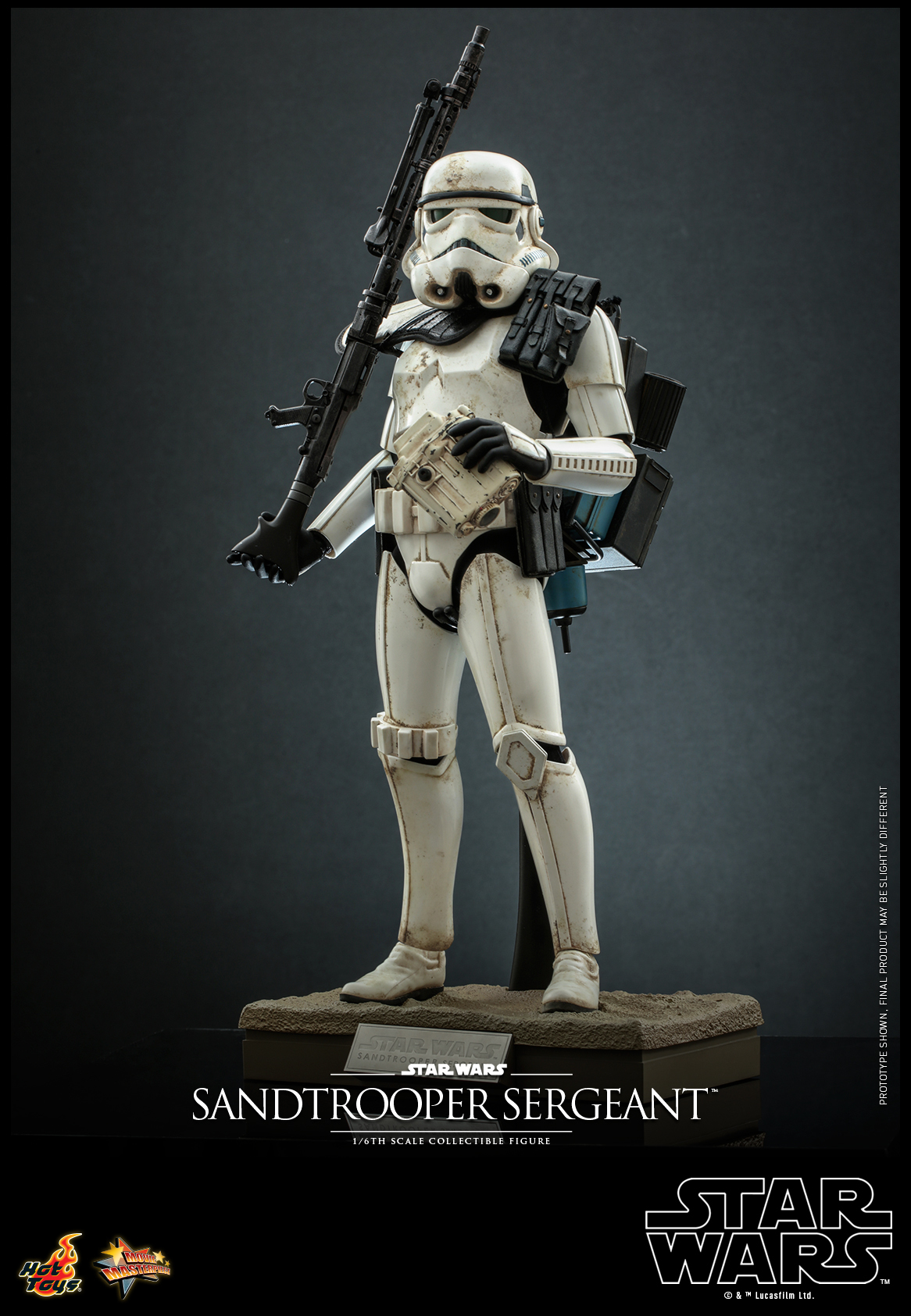 「沙漠風暴兵 (中士) 」高約 30 公分、全身共計 30 處可動,依照星戰故事設定再現了代表 Sergeant 官階的白色肩甲,以及因為長時間在沙漠環境執行任務所沾染的沙塵舊化,位於左肩的裝備包、裝備腰帶、生存背包......等造型細節也考究還原,配件包含兩把不同樣式的爆能步槍、騎乘濕背獸用的長桿、望遠鏡、一枚毀損的機器人零件、多個替換手,以及仿造沙漠環境的展示底座。