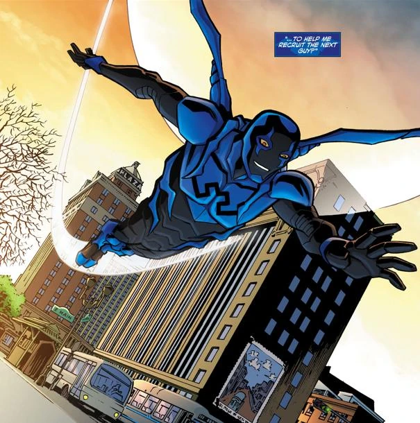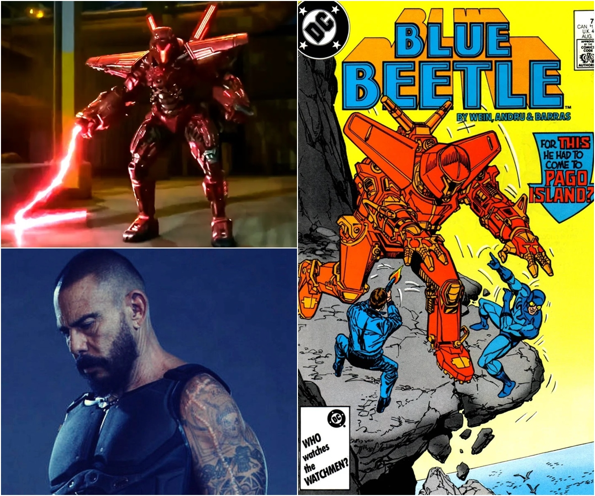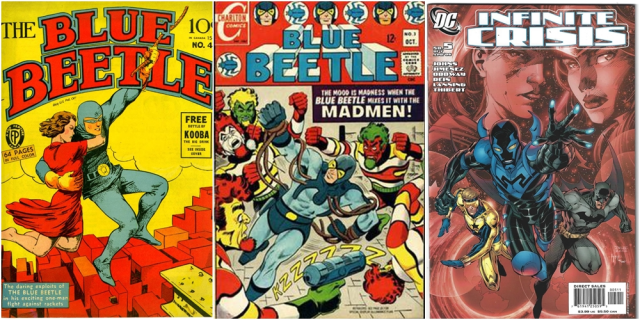 電影一開場透過大量的圖像,向我們介紹「藍甲蟲」的歷史,在這個電影宇宙中同樣也已經是代代相傳的頭銜。透過報紙介紹可以得知,「藍甲蟲」和漫畫中一樣,由第一代丹·加勒特(Dan Garrett)傳承給科德集團創辦人泰德·科德(Ted Kord),至於電影中的主角海梅雷耶斯 (Jaime Reyes)則是第三代。