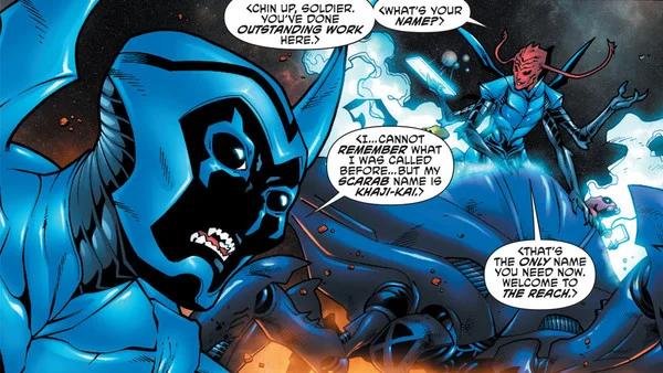 海梅和父親談心時,說到自己理想總是「遙不可及」(Out of Reach)這句話可能只是巧合,但在漫畫設定中,藍甲蟲的超能力是由「聖甲蟲」(Scarab) 所賦予,這是一種屬於外星族群 “the Reach” 為了在宇宙之間攻城掠地而打造的生命體,並會以寄生的方式掌控宿主的思想。