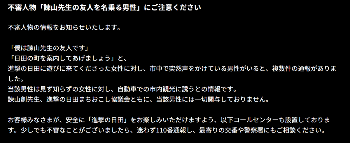 根據官方公告,該名人士會自稱是「諫山創老師友人」或是「日田市當地的嚮導」來對朝聖活動的女遊客搭話,邀約搭乘觀光車,甚至尾隨騷擾,已經有不少通報案件備受注意。由於這樣的宣稱會造成官方的名譽受損,官方也表示這男子與其完全無關,就是一個恣肆的騷掃行為。