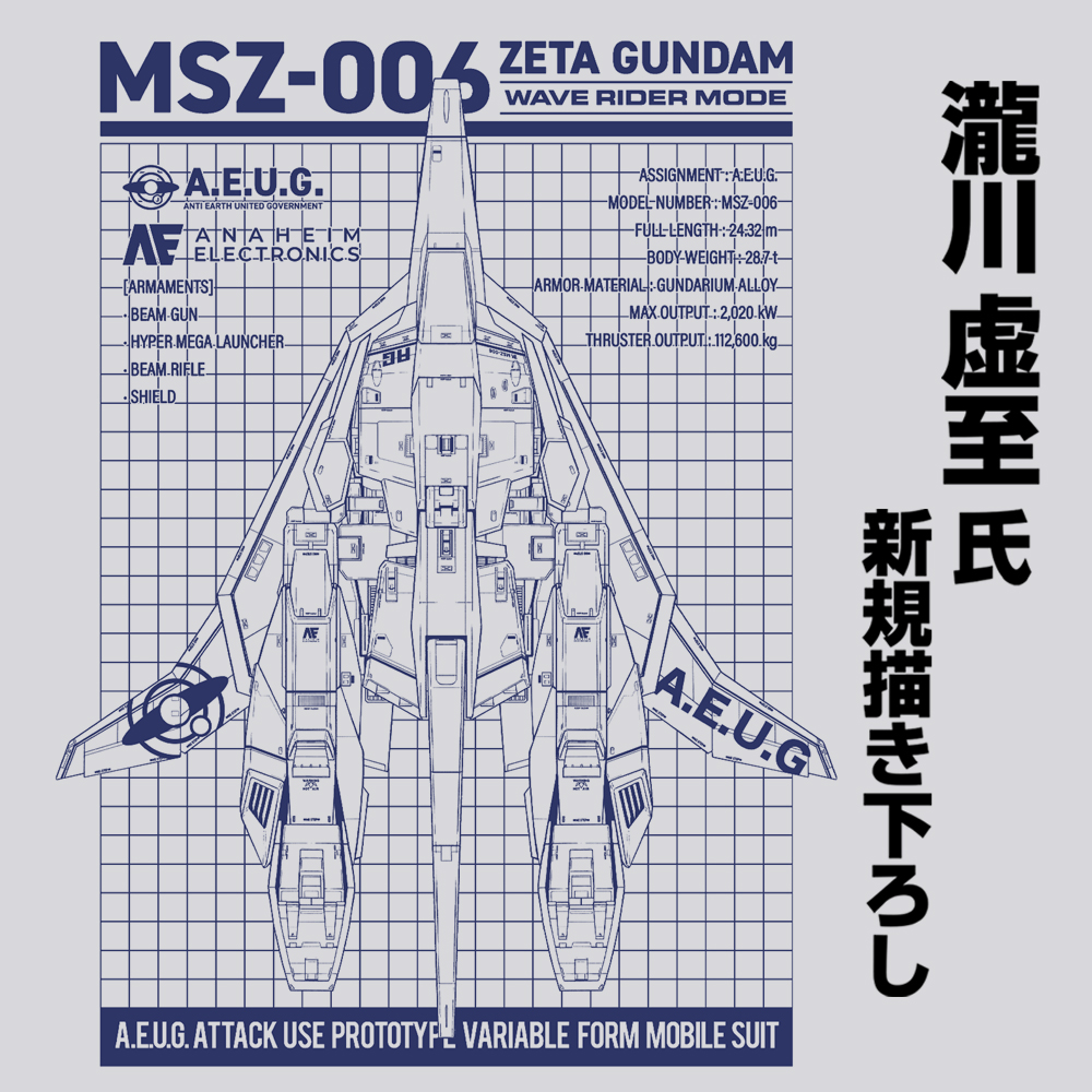 這次周邊由瀧川虛至新繪製插圖為基礎,推出多種周邊包含;MA-1 外套、兩用軍事提包、連帽外套與刺繡布章,都是以「穿波機(Wave Rider)」的 Z 鋼彈為圖像,繪圖上也頗有設定原稿的味道在,相信喜歡 Z 鋼彈的朋友應該會喜愛。
