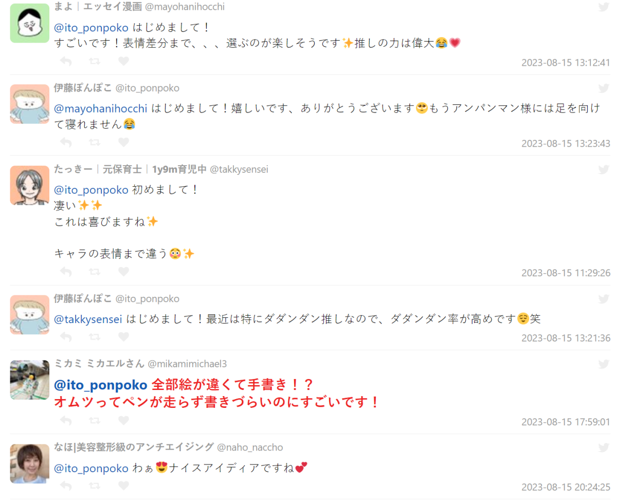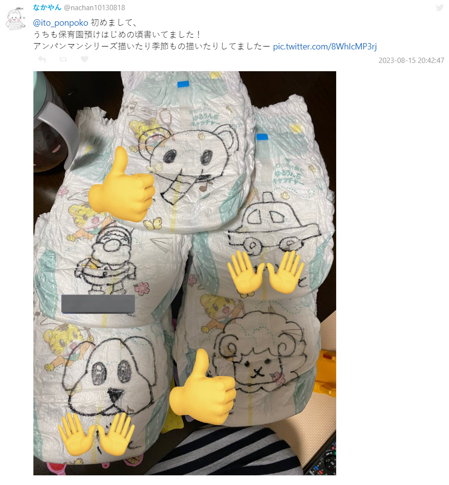 這位媽媽是一位在 X 上貼上自繪漫畫的繪師,因為 1 歲的小孩不願意穿尿布,決定透過自己的手藝來幫這些尿布加工,畫上了可愛的《麵包超人》角色圖案,每一件尿布都有不同的插圖表情,超可愛且用心的成果博得網友讚賞。