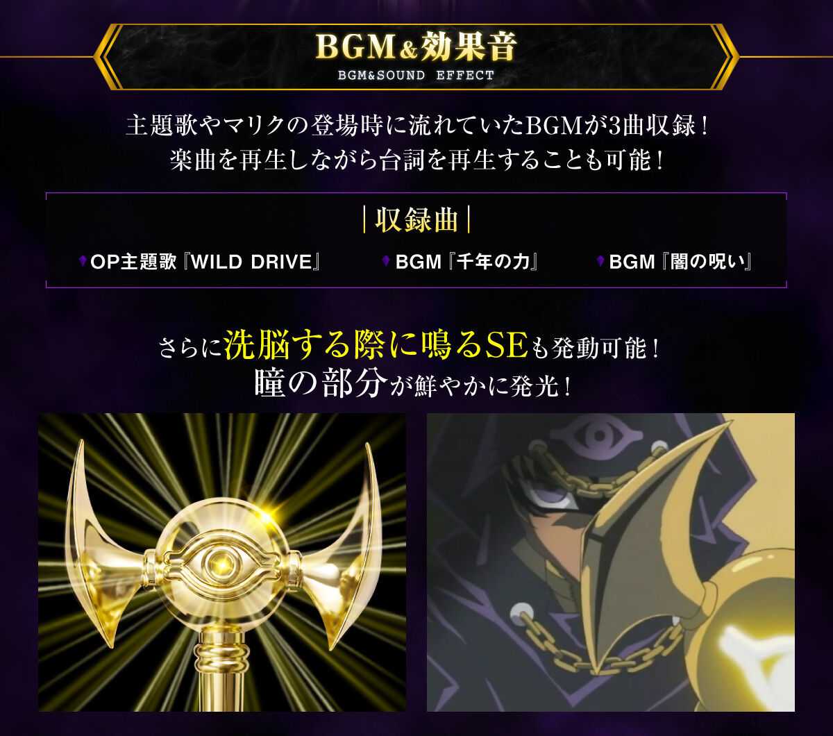 另外,還有新規錄製的效果音和台詞。共有馬利克因、闇馬利克因兩種模式,可以播出令人印象深刻的台詞!按住對話按鈕,可以切換啟動怪獸召喚、魔法、陷阱啟動等台詞。並有引出太陽神翼神龍真正力量時吟誦聖文,動畫OP主題曲《WILD DRIVE》、背景音樂等,還有洗腦音效,打造劇中決鬥的臨場感!