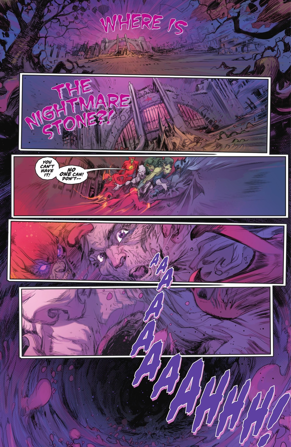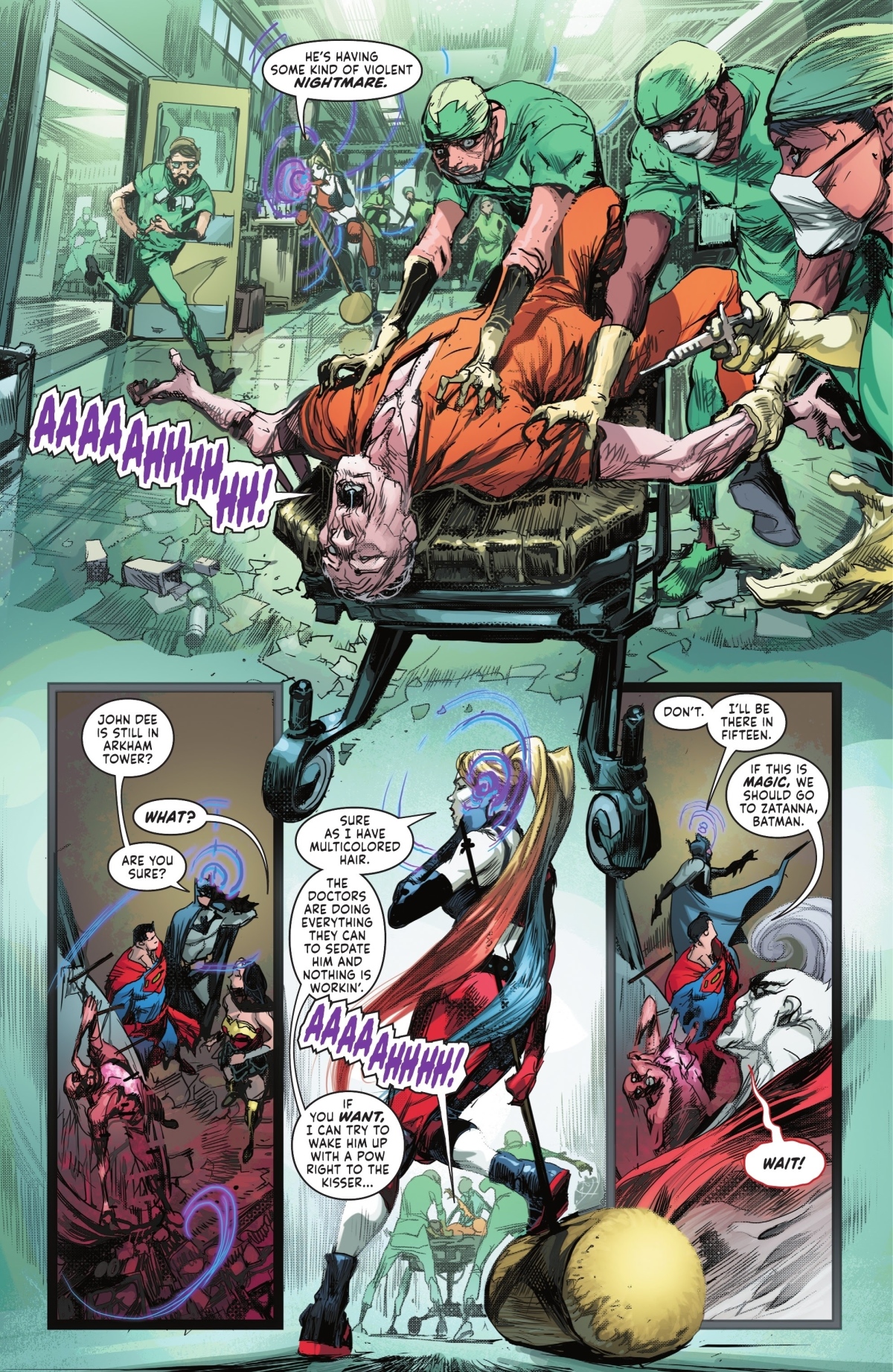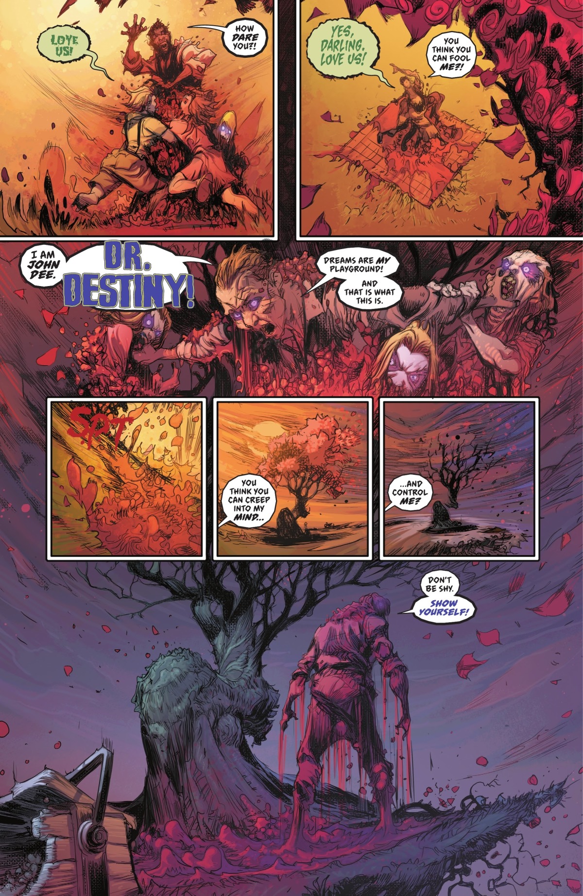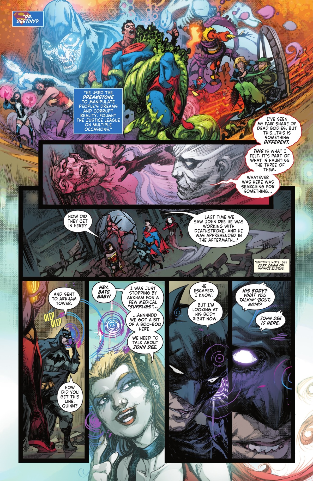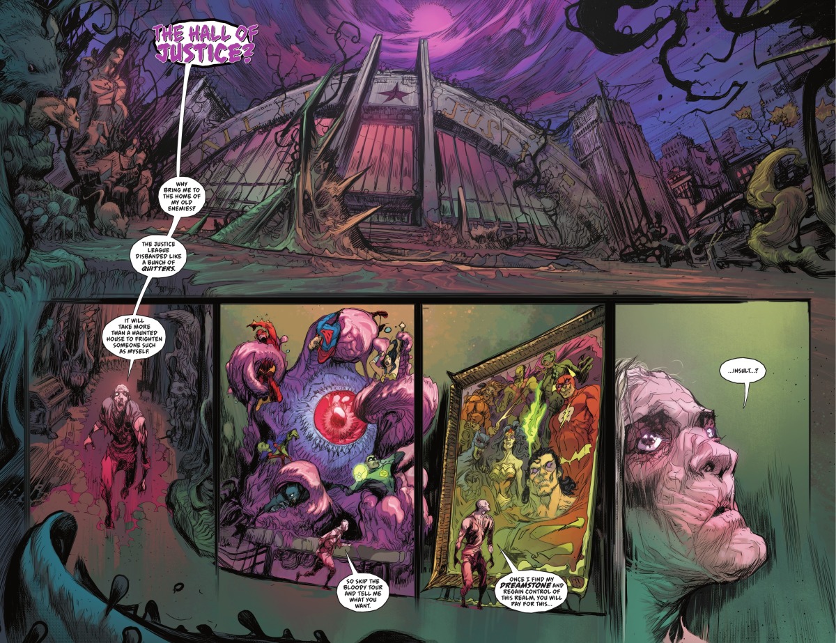「天命博士」John Dee——也就是Netflix影集《睡魔》(Sandman)當中拿了夢神的紅寶石的那個男子——在他自己的夢中遭到襲擊。這可不是什麼稀鬆平常的事情,因為夢是他最拿手和強大的領域。他一路在惡夢中來到了正義大廳,卻開始被各種惡夢化身給攻擊。