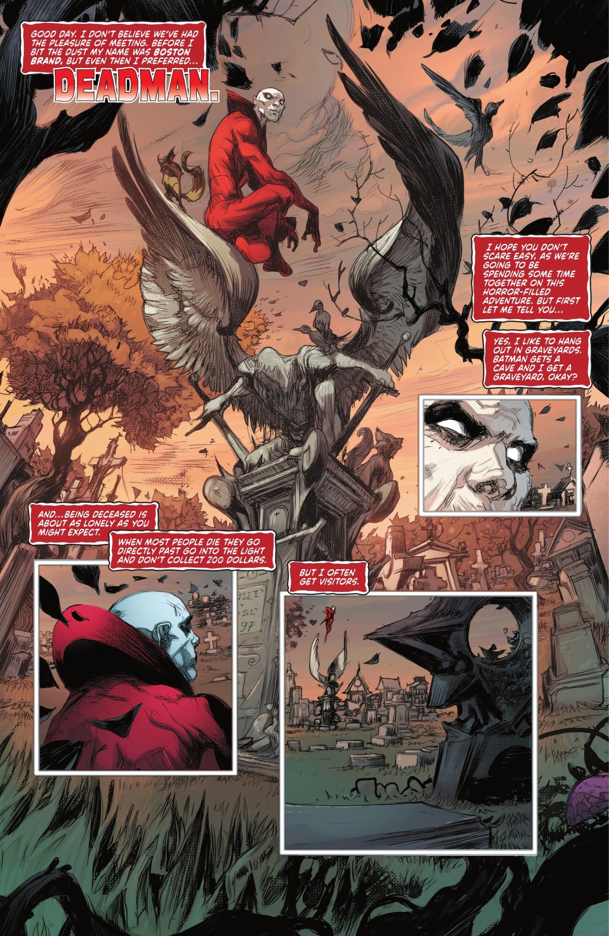 接著鏡頭來到這一次的主角「死人(Deadman)」身上。做為一個超級英雄,他的狀態實在過於奇怪——因為他完全就是個死人,不附身在他人身上甚至無法與生者交流。