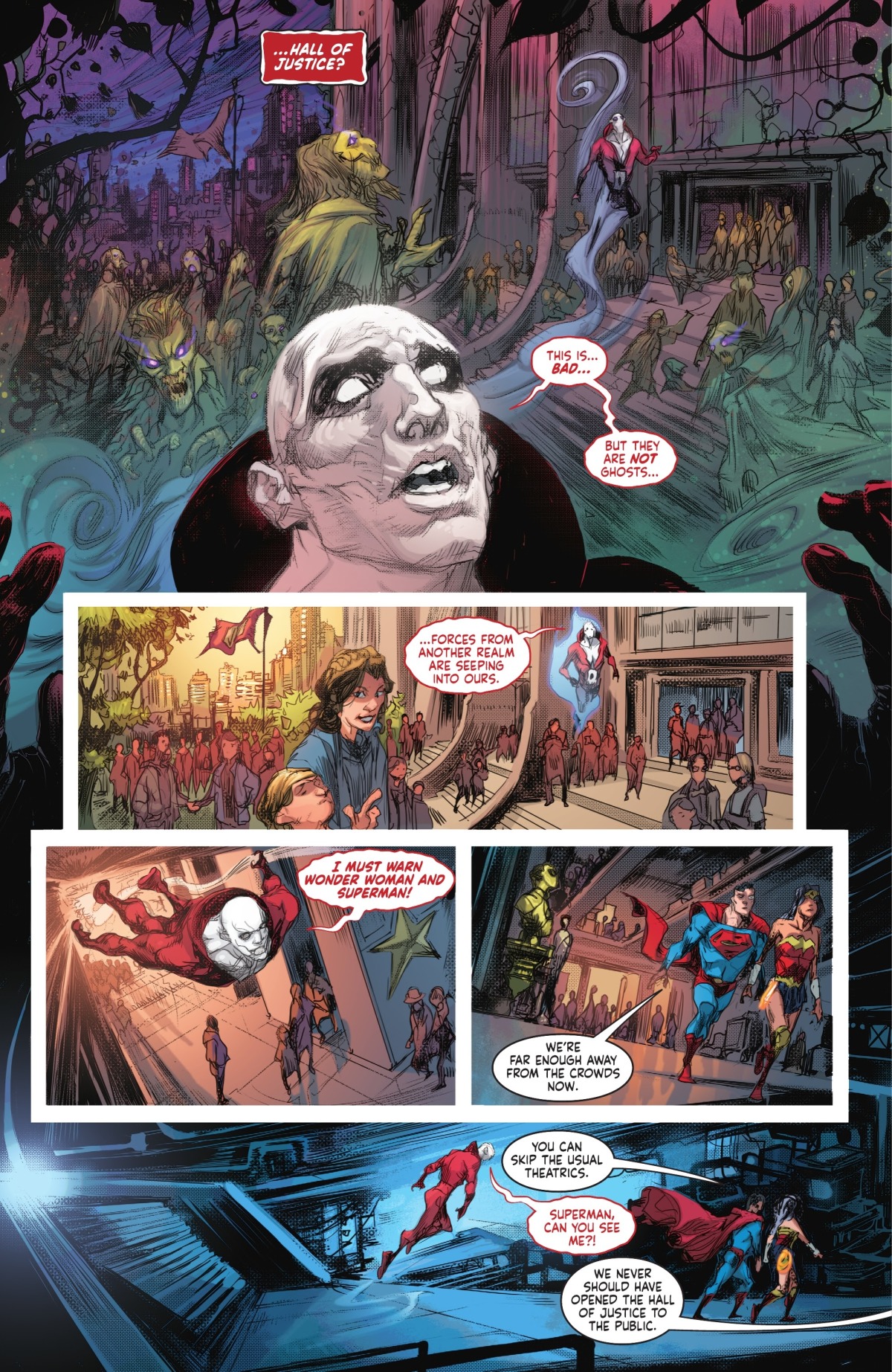 原本他正在悠閒,卻發現飛過他身邊的超人和神力女超人身上都有不祥的氣息,於是跟蹤在他們身邊,來到了目前已經沒有在使用的正義大廳。