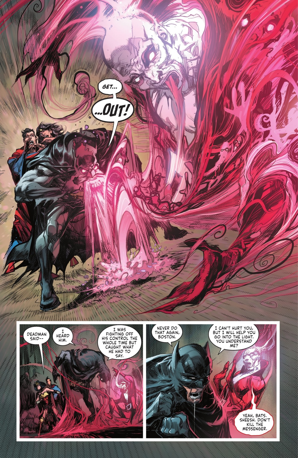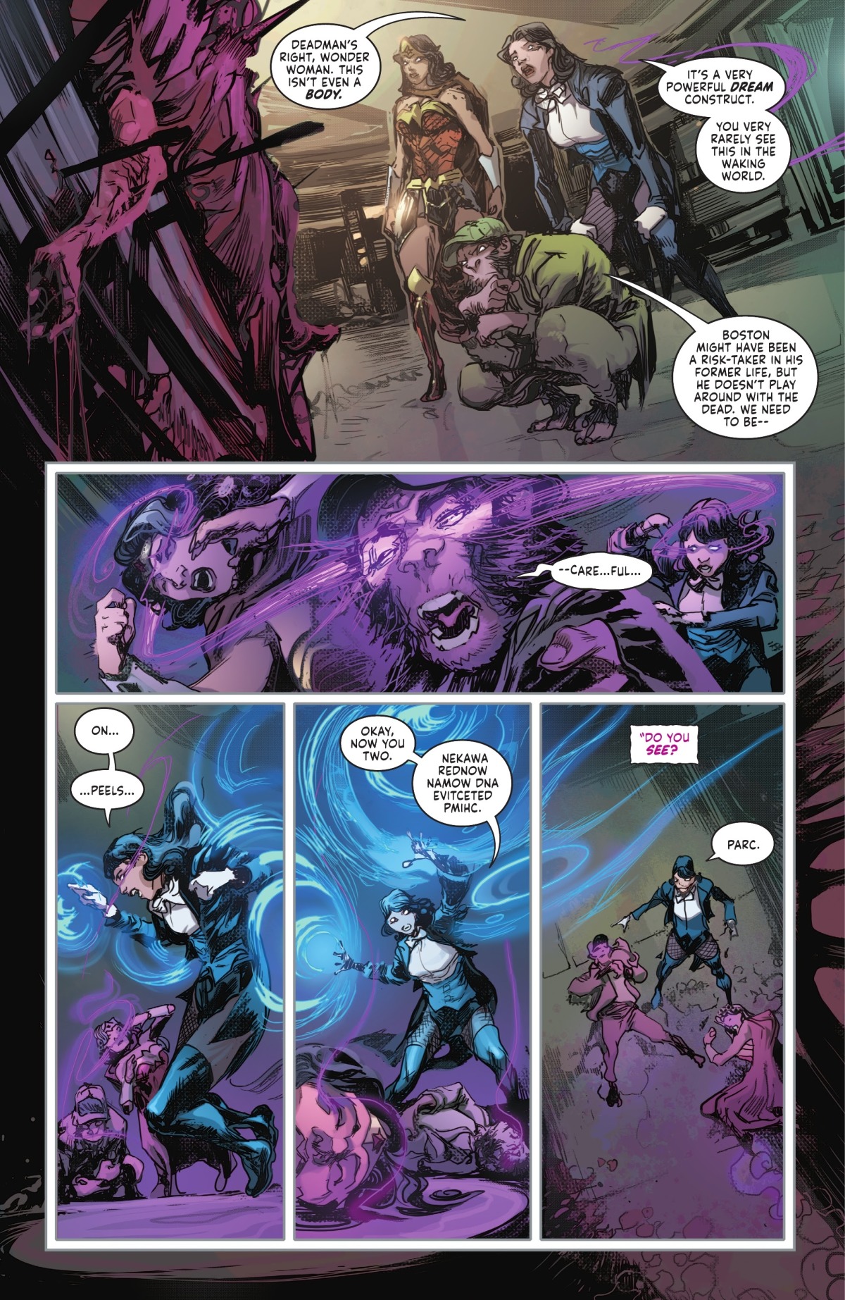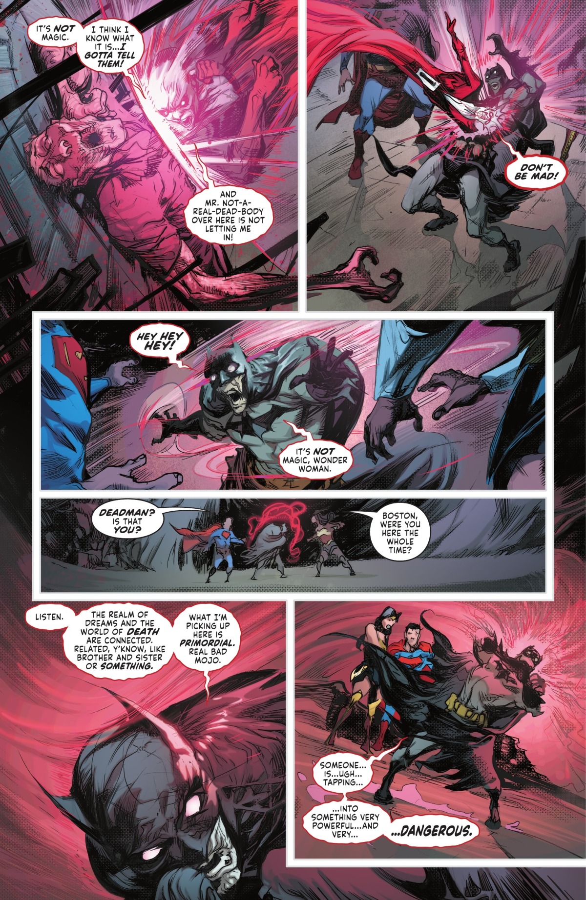 死人知道這不是魔法的造物,而是某種更為原始和危險的東西;為了傳達訊息,他不得不附身在蝙蝠俠身上好與另外兩人對話。他也提到夢與死亡有著親屬關係,這倒不假,有看過《睡魔》的人都能理解他在說什麼。