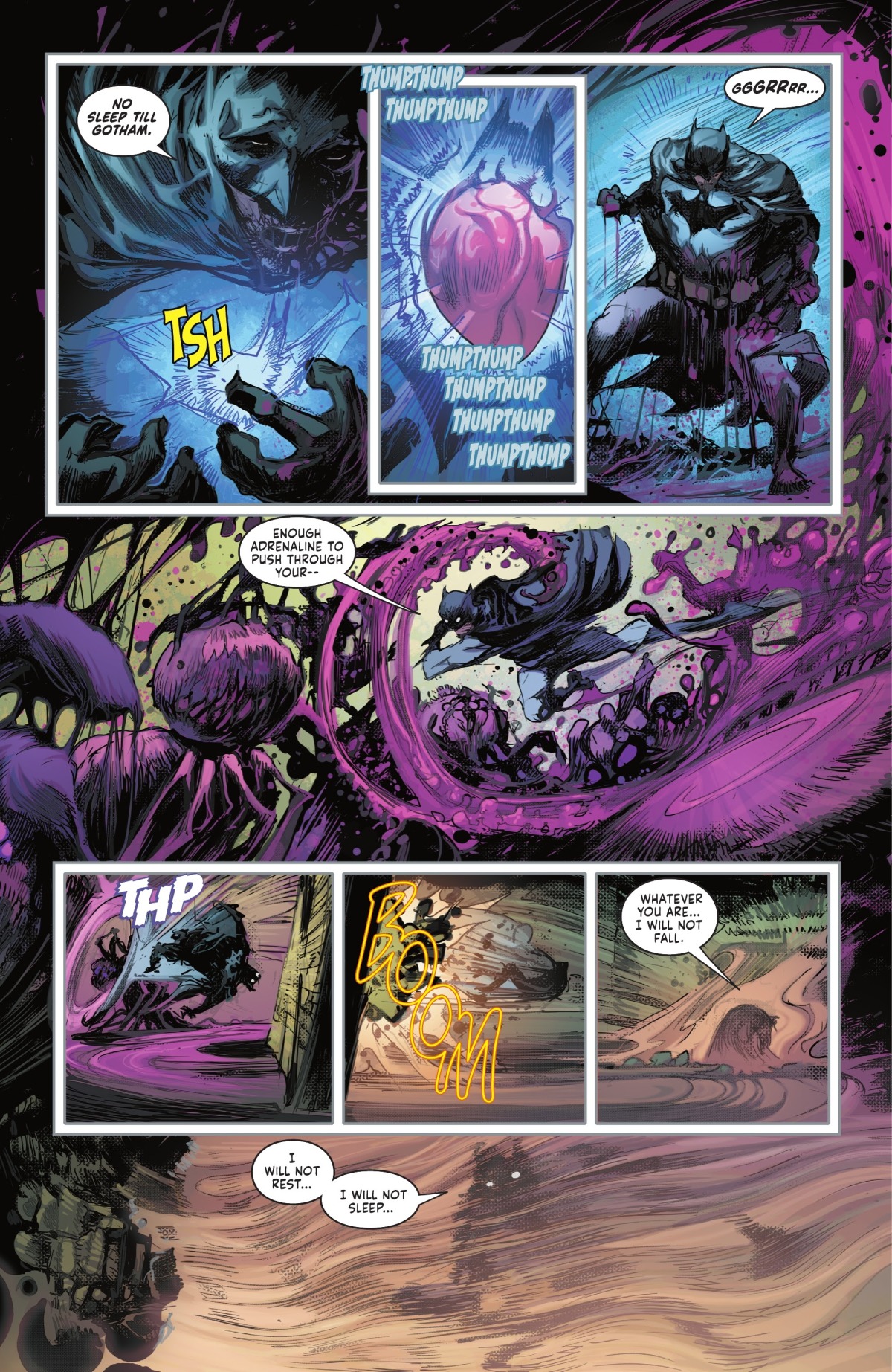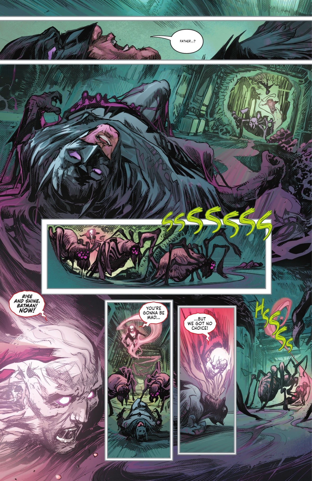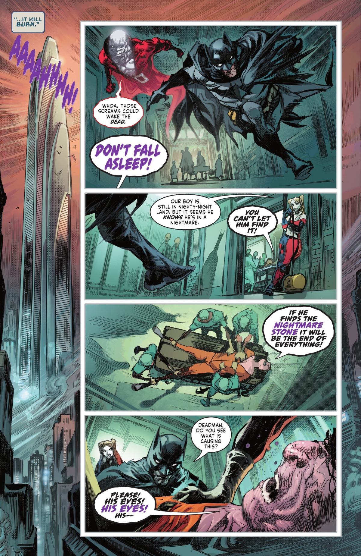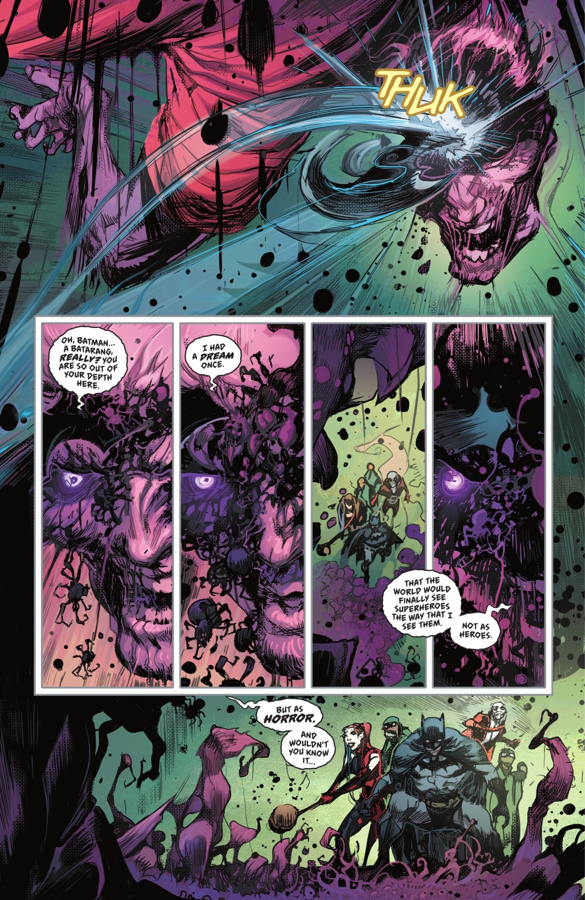 正在與本尊造出的蜘蛛型惡夢造物戰鬥的哈莉和蝙蝠俠當然也即將陷入惡夢之中但是蝙蝠俠啟動了戰衣內的應急裝置,強行讓自己保持清醒