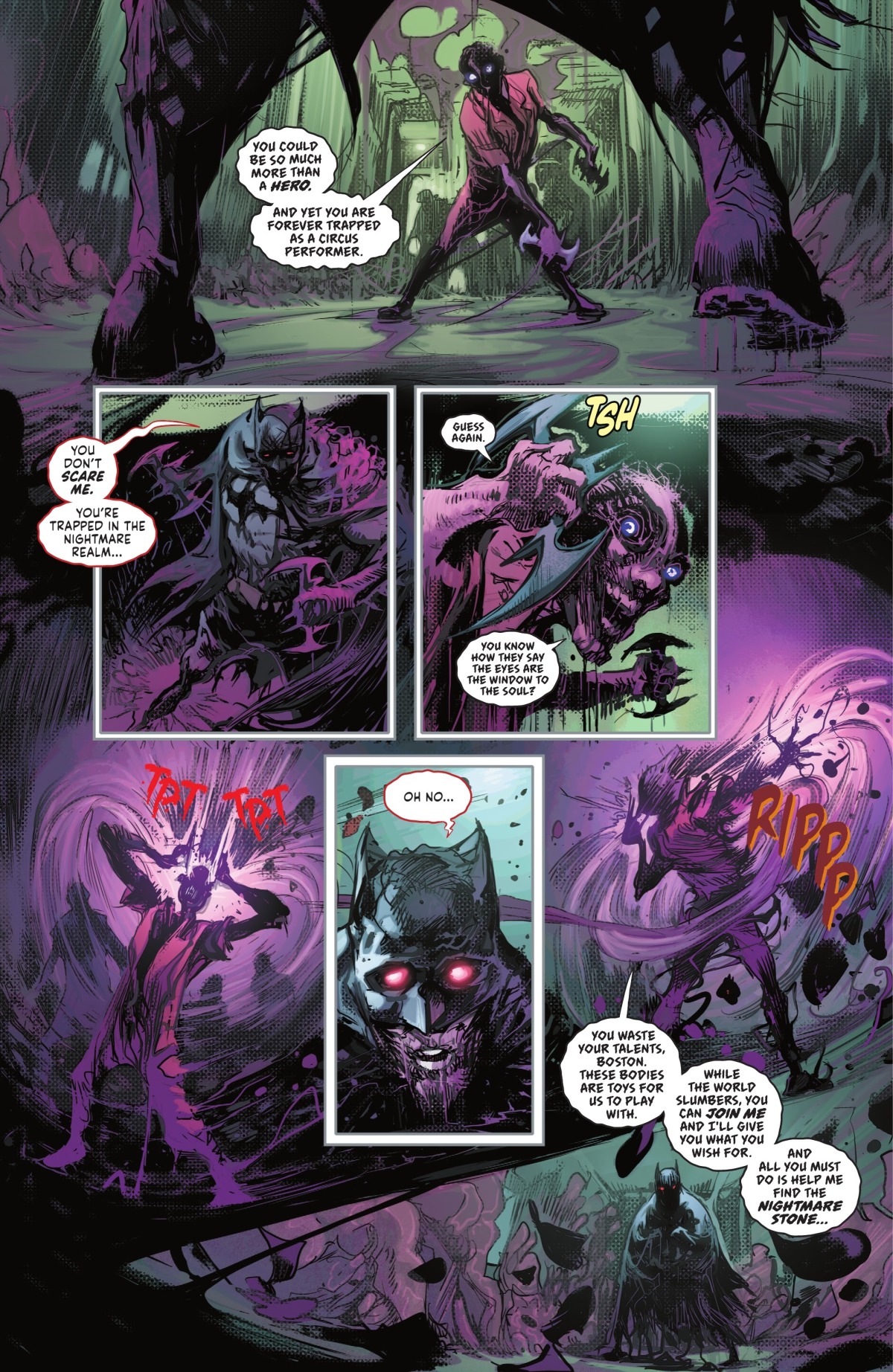 接著我們可以看到DC宇宙當中大部分有頭有臉的角色都得到了自己的《騎士驚魂》短篇故事,講述他們被送入惡夢維度後所身處的那些惡夢!但是失眠苦苦追求的惡夢之石究竟是被天命博士藏在了哪個正義聯盟成員的夢境之中呢?