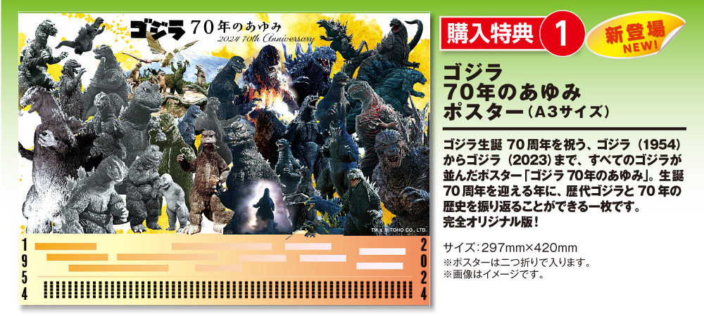 另外,少不了的還有有購入特典,首先就是 70 周年的紀念 A3 海報,集結各年代的格吉拉一併登場,響應這 70 周年的歷史榮耀。
