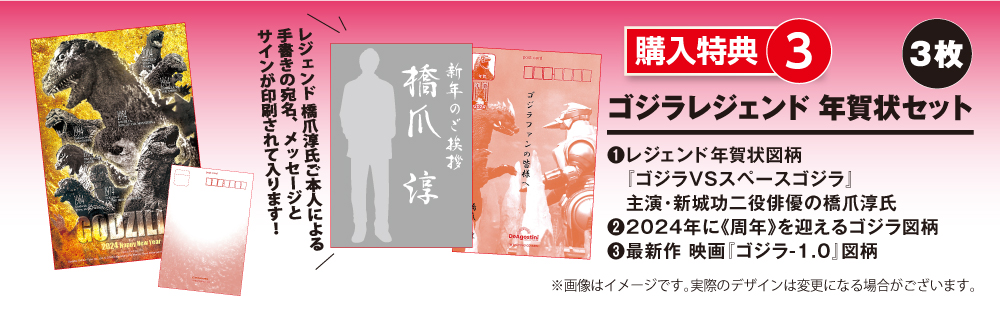 還有專屬的年賀狀組合,上面更有 1994 年《哥吉拉vs太空哥吉拉》主演的橋爪淳手寫的祝賀文字,另外還有兩張 70 周年 & 未來最新電影《哥吉拉-1.0》的樣式。