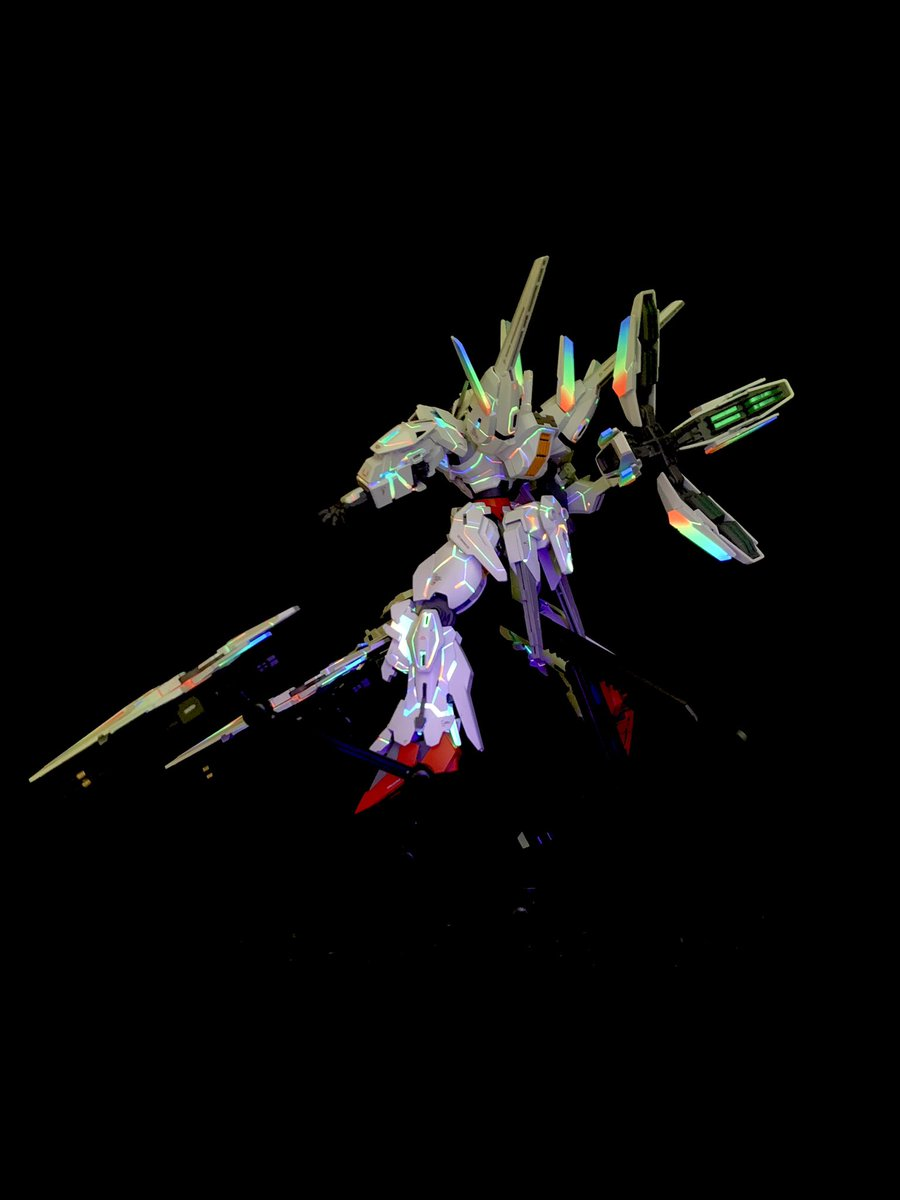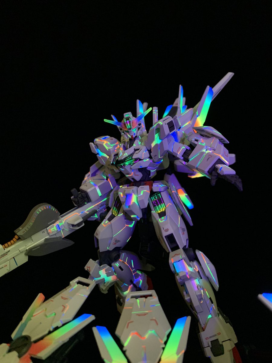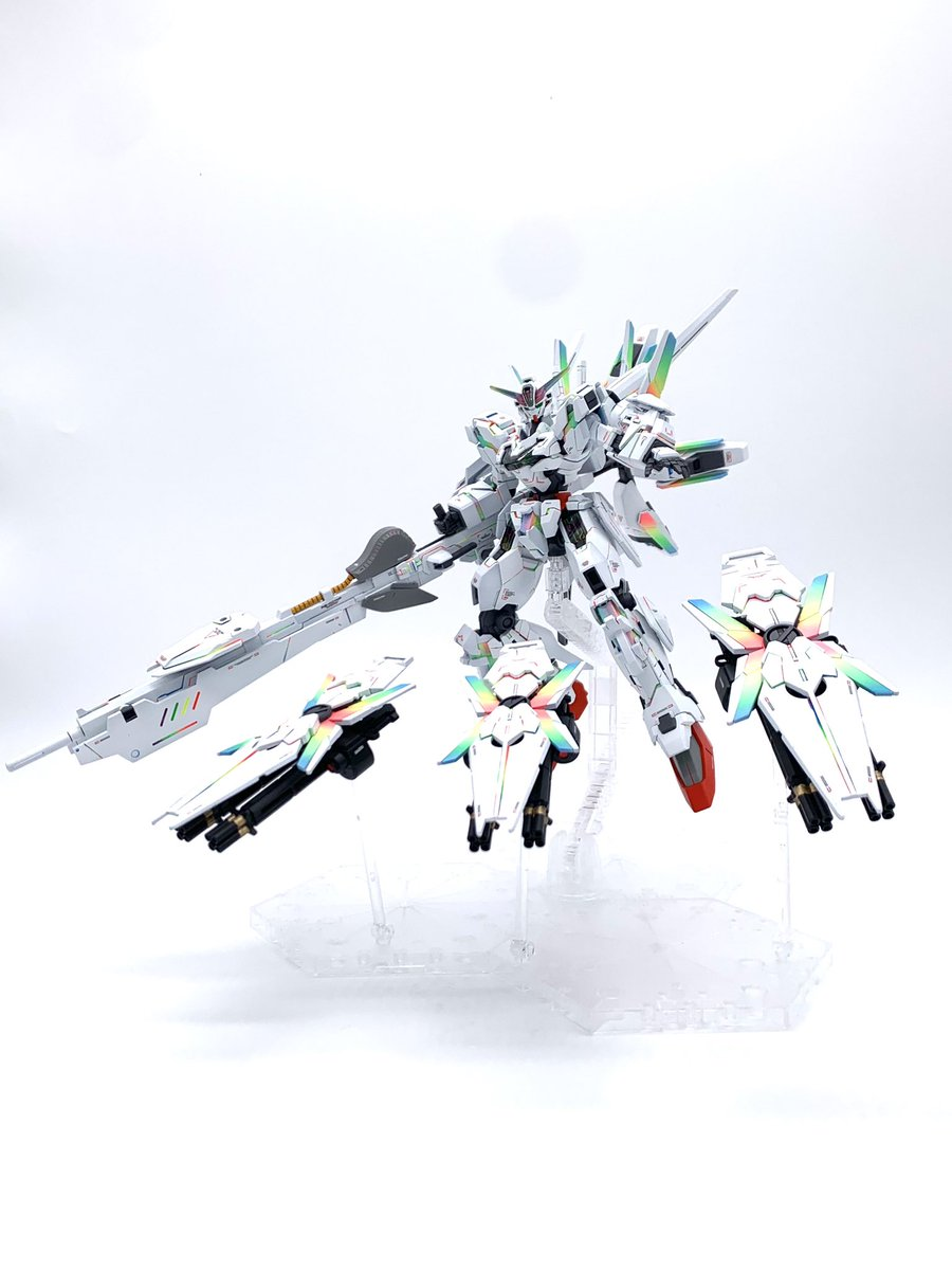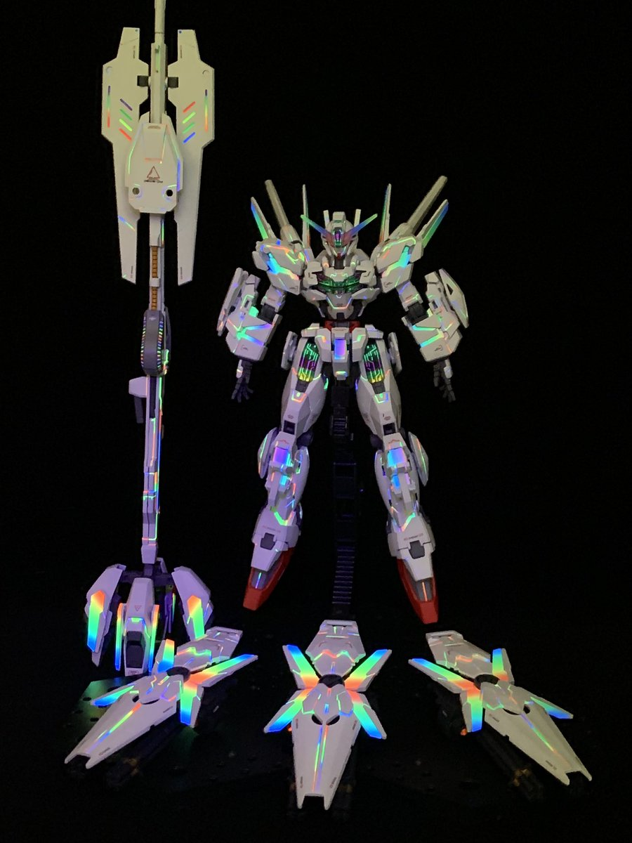 根據プリン表示,它是參考 YouTube 頻道イタミテックチャンネル所介紹的方式去製作,透過自行印下貼紙後將貼紙再行著色,讓異靈鋼彈全身可以煥發出彩虹般的色彩。