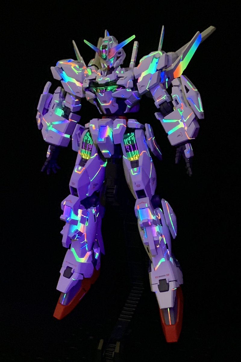 這邊要來介紹的是推主プリン ( @lGurGbe3Bgl0MMk ),他透過手作螢光貼的方式,將《機動戰士鋼彈 水星的魔女》 「HG 1/144 異靈鋼彈」 改造成類似 RGB 電競風格的樣貌,閃耀著劇中「帕梅特刻痕」的姿態博得不少網友讚賞。