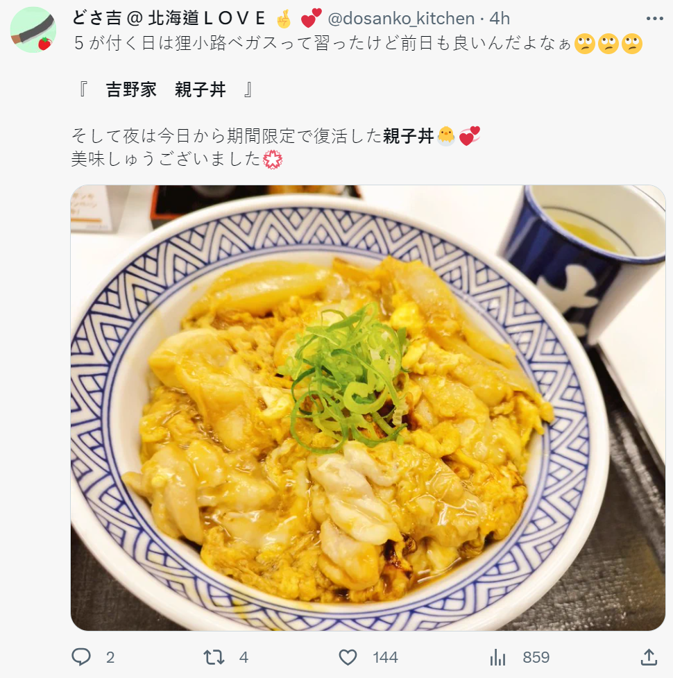 當時雖然日本有雞蛋短缺的問題,但其實影響並不久,有網友臆測是因為進口雞肉漲價的關係停賣。不過這次回歸,卻被人發現其實是漲價歸來,過往便宜的中碗僅 437 日圓,卻一次漲價到 547 日圓,110 日圓的漲幅也讓不少網友哀悼物價真的難以回歸。