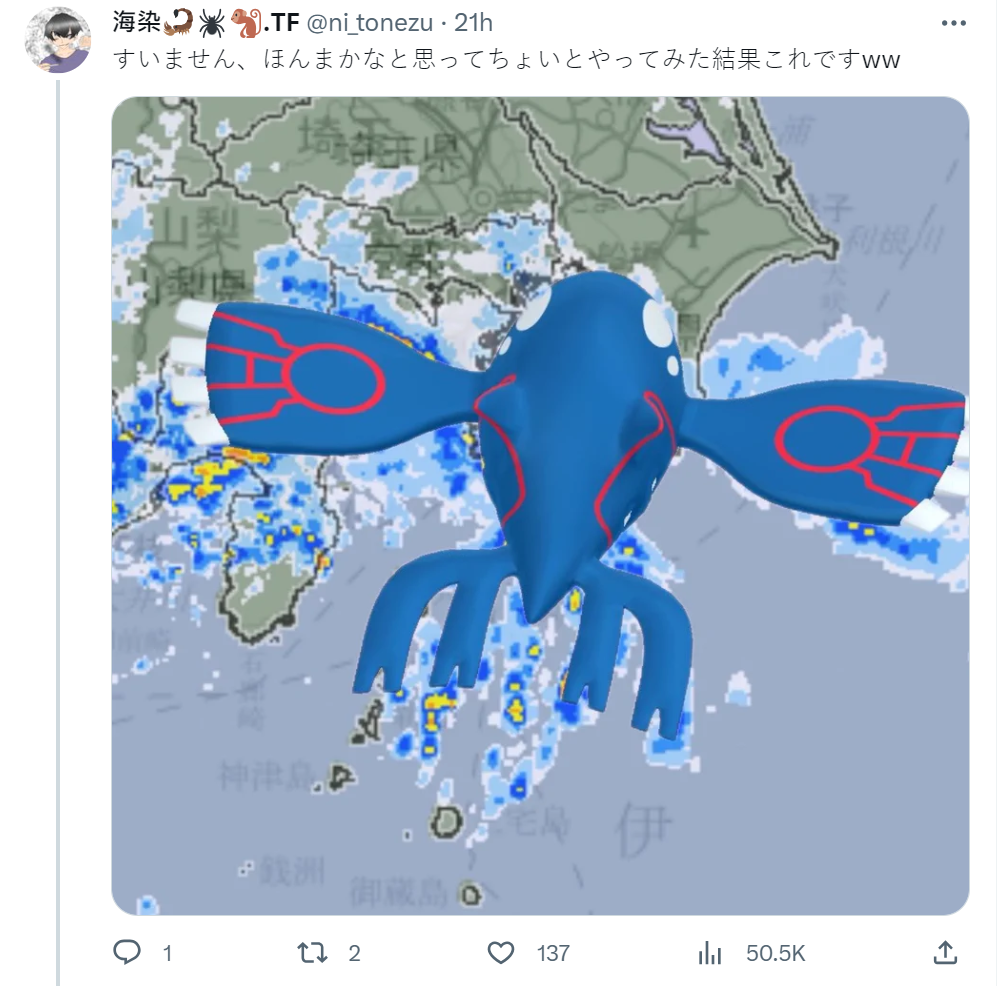 昨日 ( 8/24 ) 在日本 X 上,因為中午雨勢滂沱,有網友查了東京上空的衛星雲圖,意外發現上面的雨雲分布,形狀很像是《寶可夢》的蓋歐卡,分享到 X 上後意外成為趨勢話題。