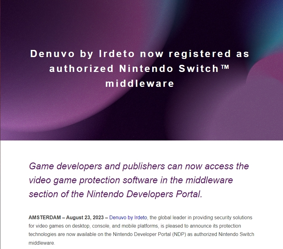 對於任何一款遊戲來說,總是很難避免盜版氾濫的問題,對於作為電玩產業三巨頭之一的任天堂來說,同樣也是一個必須面臨的課題,來試圖找尋方法徹底打擊非法遊戲。而在去年傳出任天堂選擇與加密軟體Denuvo開發商Irdeto進行合作之後,在今日也確認該防盜軟體正式於Nintendo Switch登陸。