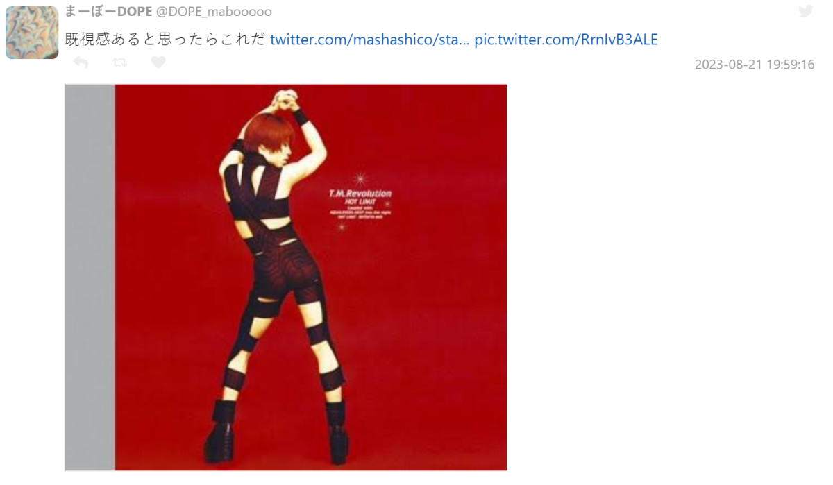 當然這種樣子也讓人想到T.M.Revolution(西川貴教) 經典歌曲《HOT LIMIT》裡的裝扮 XD。