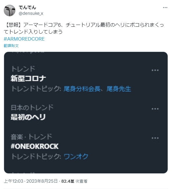 不少玩家直接在這個直升機首領處卡關卡到爆,直接讓「最初的直升機」(最初のヘリ )這個關鍵字登上了推特趨勢。而也有玩家表示,「直升機是讓吾等理解AC為什麼要有手腳的偉大老師」XDD。