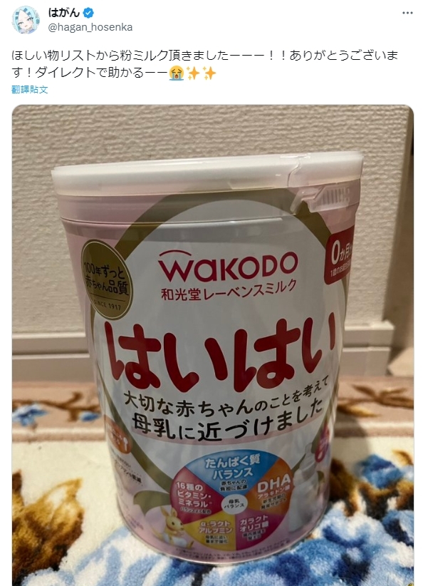 繪製《二十年後的英雄和少年》(20年で色々変わっちゃったヒーローと少年)、《四天王住在老家》(四天王は実家暮らし)等作的漫畫家「はがん 」,最近就在推特開心發文,表示自己收到粉絲送的、原本在他Amazon願望清單裡的「嬰兒用奶粉」。