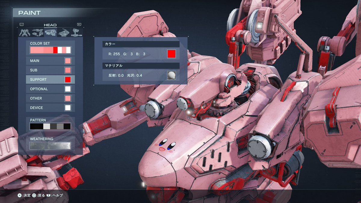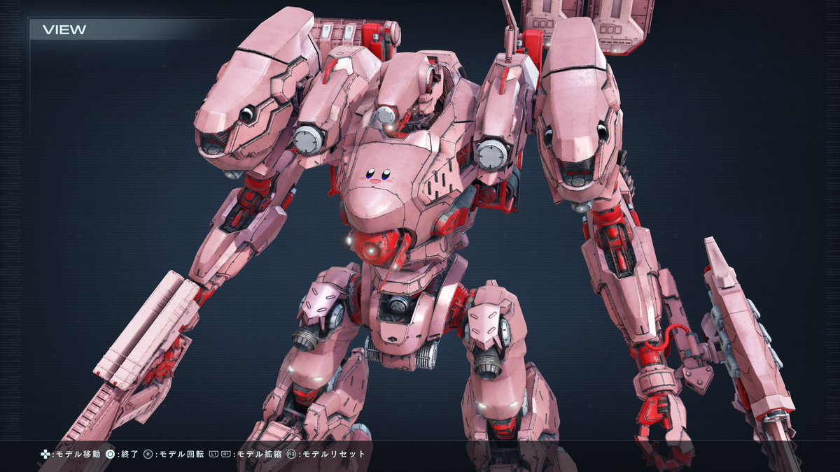 看看這台機器人的胸甲上還有可愛的卡比臉龐,全身粉色系的樣貌感覺在《機戰傭兵》這種鋼性強烈的風格之中,格外有種趣味感 XD。