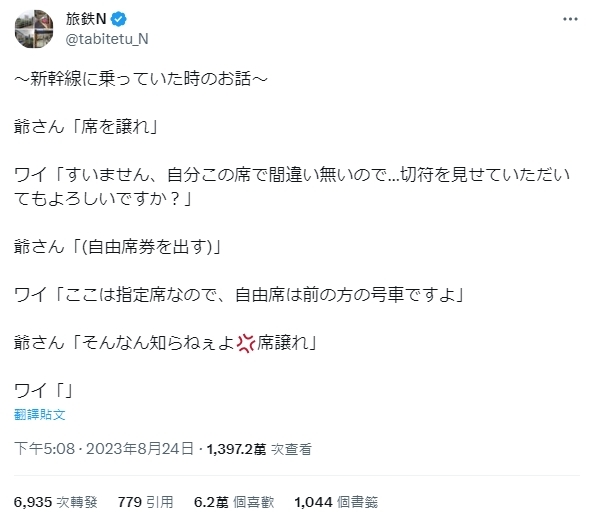 推主在搭新幹線時,遇到一位年長的老先生,一來就用相當沒禮貌的口氣要求推主讓位。