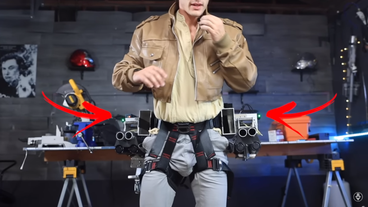 「立體機動裝置」最具著名的就是可以發射固定的定錨,JLaservideo 嘗試製作發射器並透過繩索把定錨能夠射出,並能插入牆壁上收回讓人能夠像動畫裡面一樣被拉向空中,嘗試能接近原作。