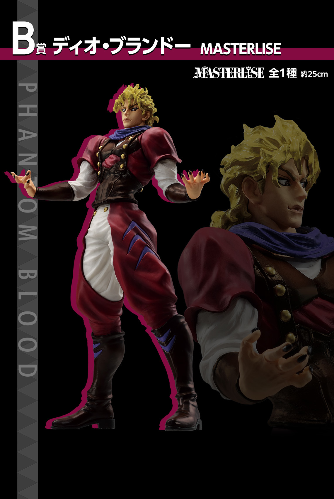 「一番賞 JoJo的奇妙冒險 PHANTOM BLOOD&BATTLE TENDENCY」,推出 A~I 與最後一賞、雙重機會賞等 10 個不同級別的獎品,共有五款角色模型,為高階造型「MASTERLISE」系列打造,細膩再現精緻的服裝細節,並以約 25 公分的魄力尺寸呈現,分別有:喬納森·喬斯達、迪奧·布朗度、喬瑟夫·喬斯達、西撒·安東尼奧·齊貝林、麗莎·麗莎等經典角色。另外還有石仮面 MASTERELIVE COLLECTION、橡膠杯墊和水杯等精彩的賞品,最後賞則是喬瑟夫·喬斯達(最終決戦ver.)!