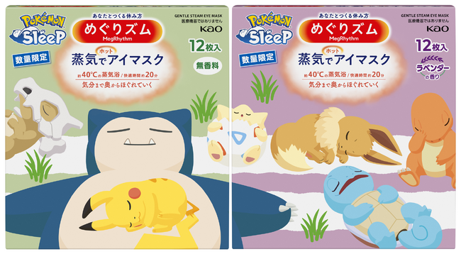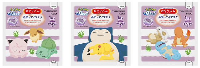 而花王「美舒律」蒸氣眼罩包裝設計,也很貼心地採用《Pokémon Sleep》遊戲中的睡姿圖鑑,除了卡比獸/皮卡丘之外,更包含了噴火龍/可達鴨、火球鼠/小鋸鱷/皮卡丘、卡蒂狗/喵喵/伊布、胖丁/伊布/妙蛙種子,以及卡拉卡拉/小火龍/傑尼龜等六種設計。