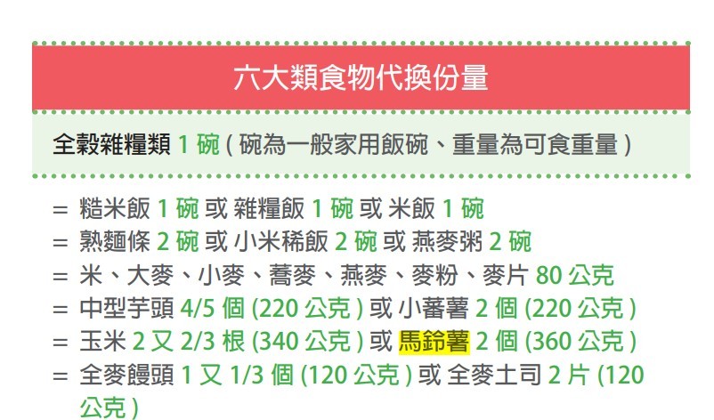 以衛福部國健署的「每日飲食指南手冊」分類來說,由於馬鈴薯富含碳水化合物,因此跟米飯、麵粉等一樣屬於「全榖雜糧類」。根據該手冊指出, 2 顆馬鈴薯(約 360 克)約為1碗「全榖雜糧類」,依照每個人對熱量需求不同,每天需要約 1.5 ~ 4 碗的全榖雜糧類。