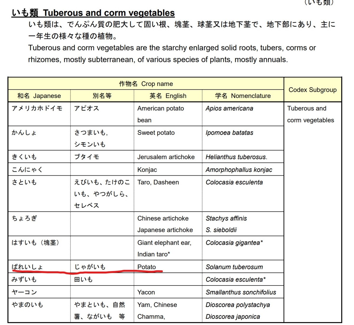雖然在營養方面馬鈴薯毋庸置疑不屬於「野菜類」、甚至比較像「全榖雜糧類」 ,但是在種植作物的分類又是如何呢?同樣根據日本的農林水產省的作物分類可以看到,馬鈴薯的確屬於「野菜類」底下的「いも(芋)類」。