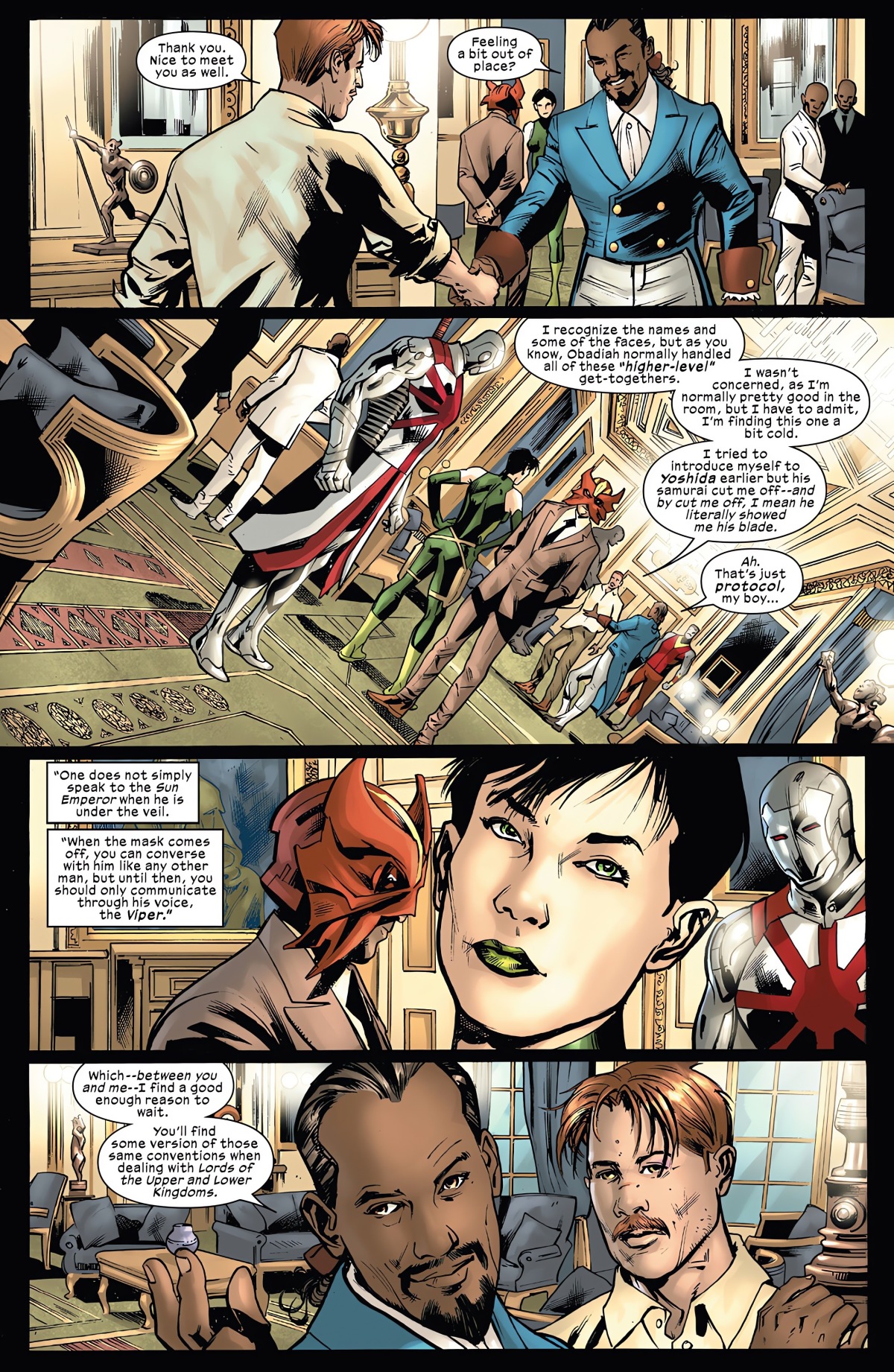 首先,熱情接待他的是達‧柯斯塔(Da Costa)家,在正史宇宙中是南美洲的富裕家族,變種人「太陽黑子(Sunspot)」就是這個家族的一員。霍華試圖與日本人溝通,卻差點被「銀武士(Silver Samurai)」砍成兩半:因為他犯了「陽帝(Sun Emperor)」的禁忌,沒有透過他的代言人「毒蛇(Viper)」來對話;這三人在正史宇宙中都是變種人,陽帝便是我們熟悉的「陽炎(Sunfire)」。