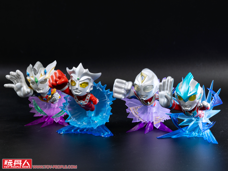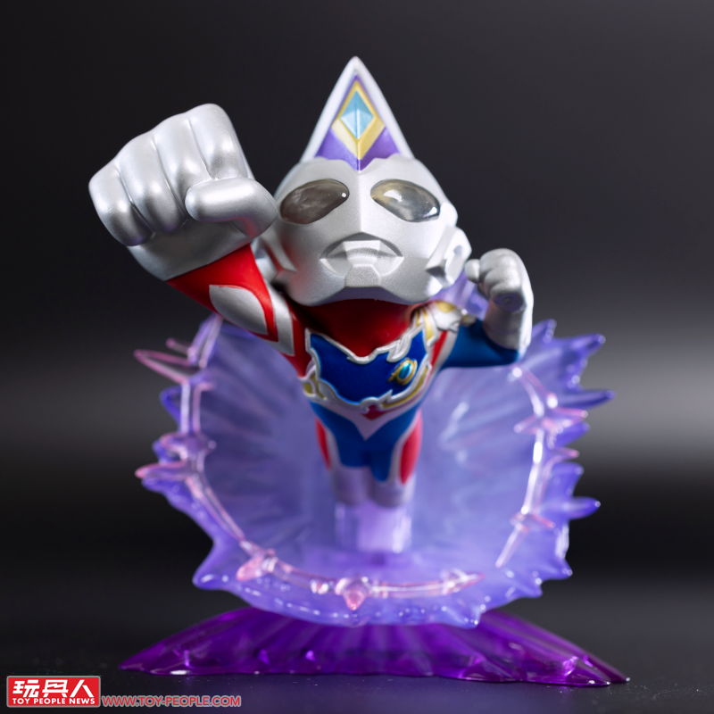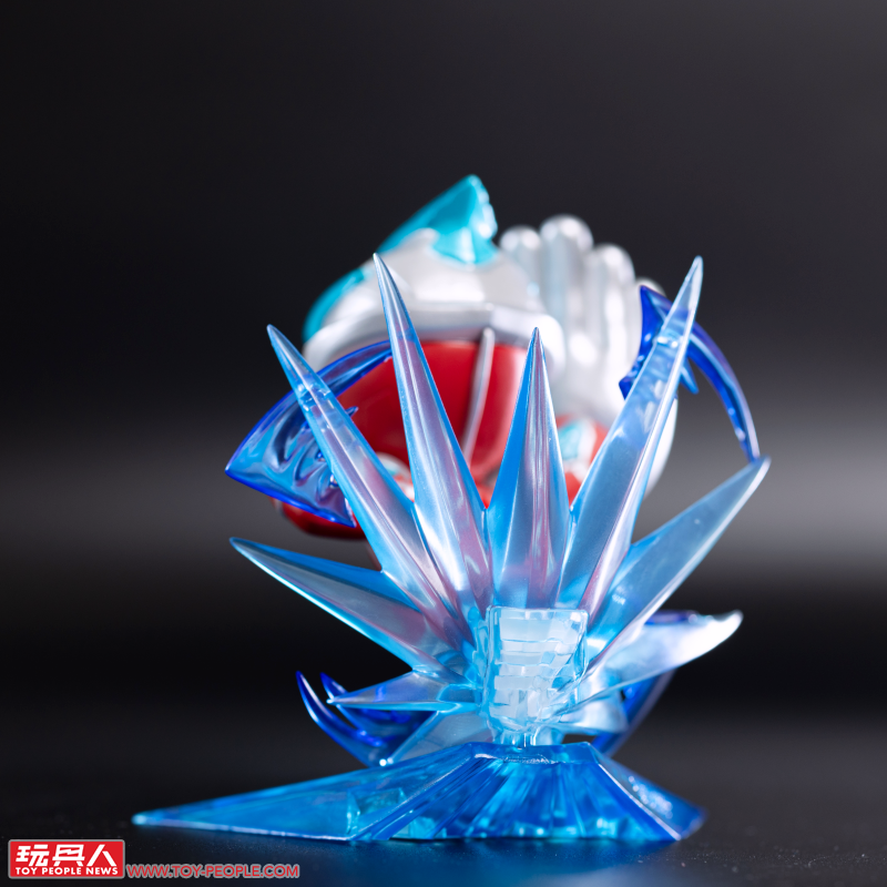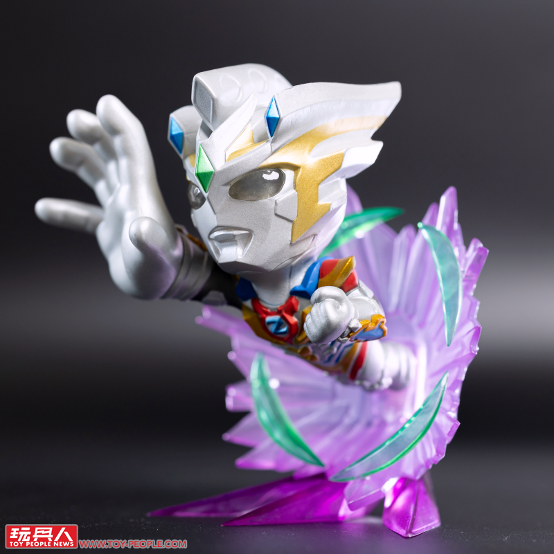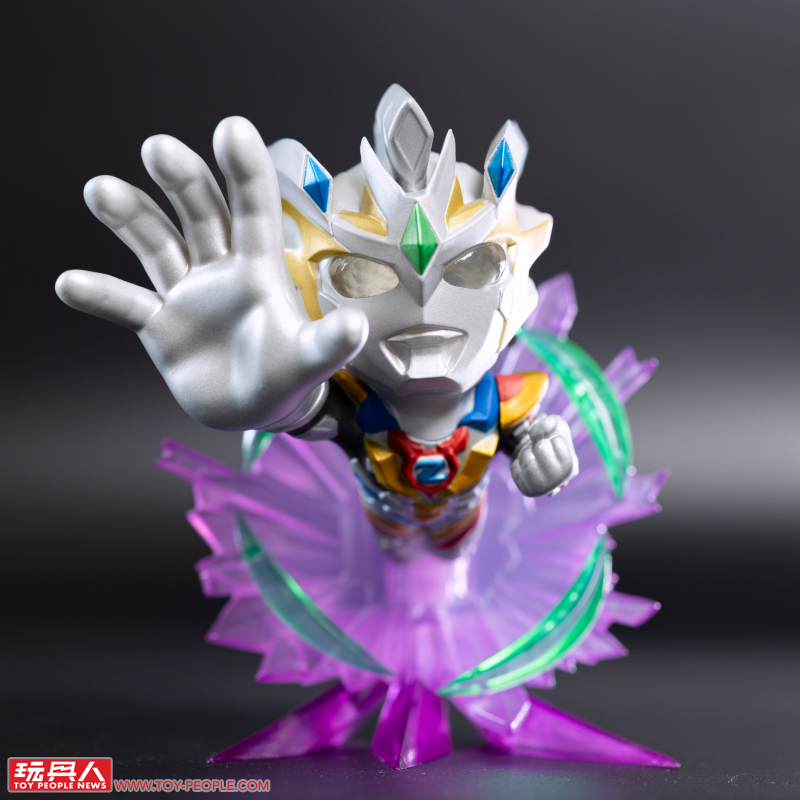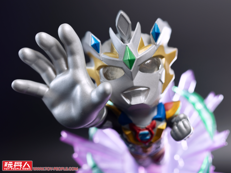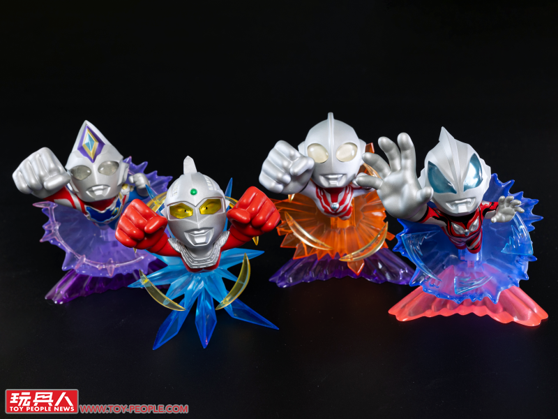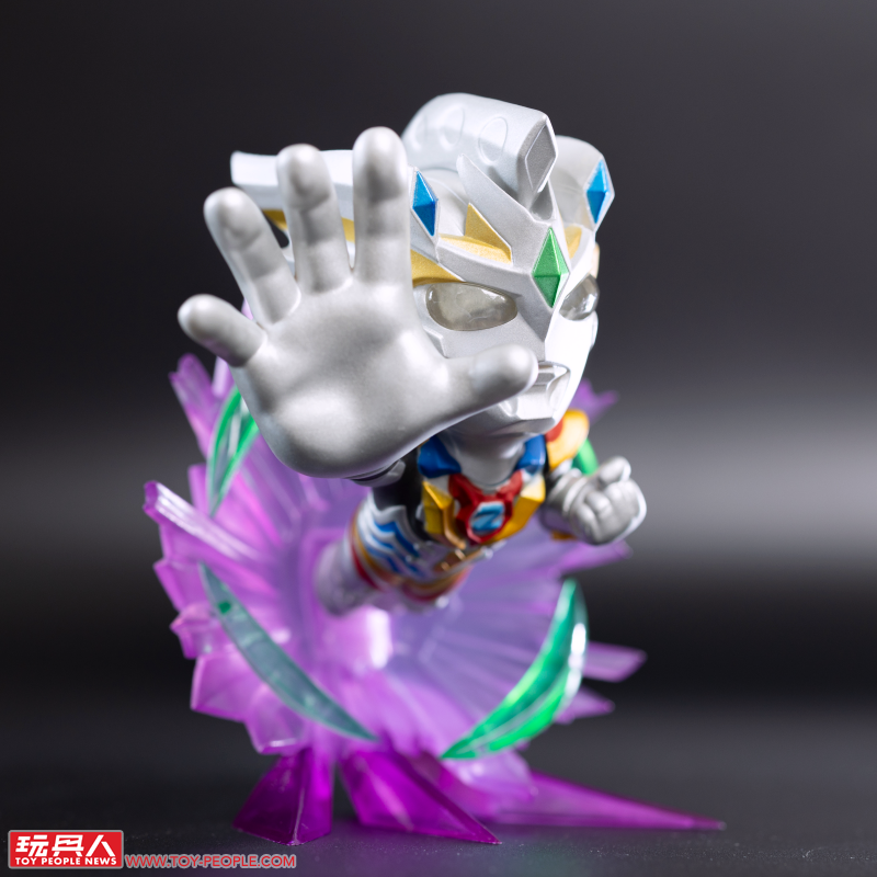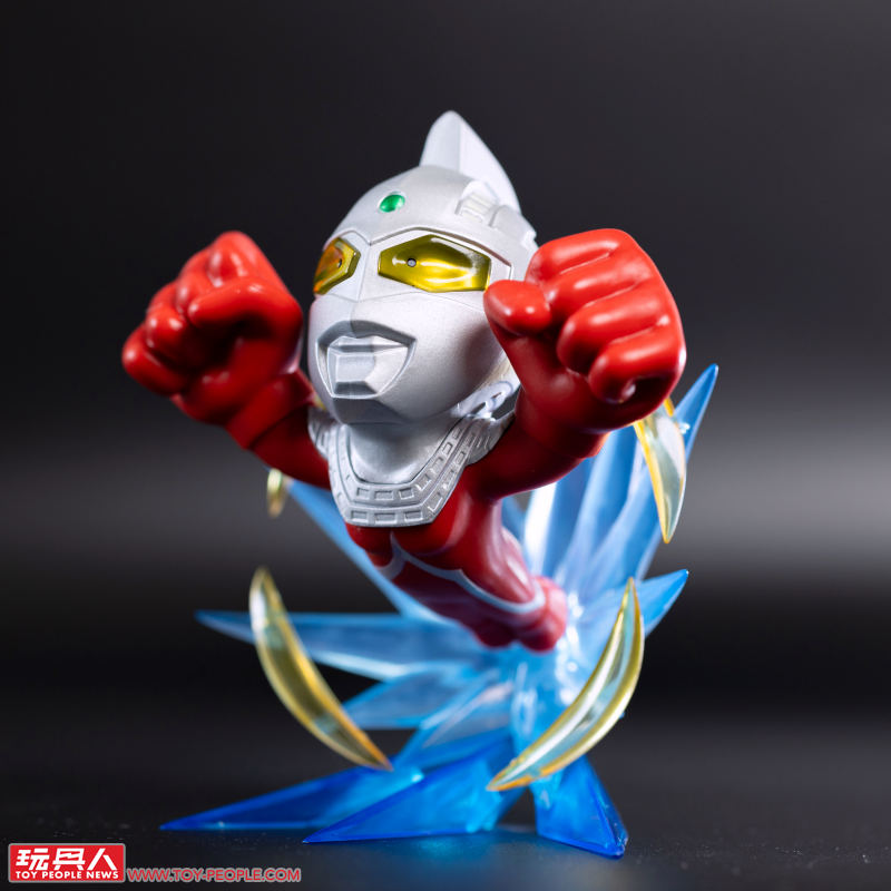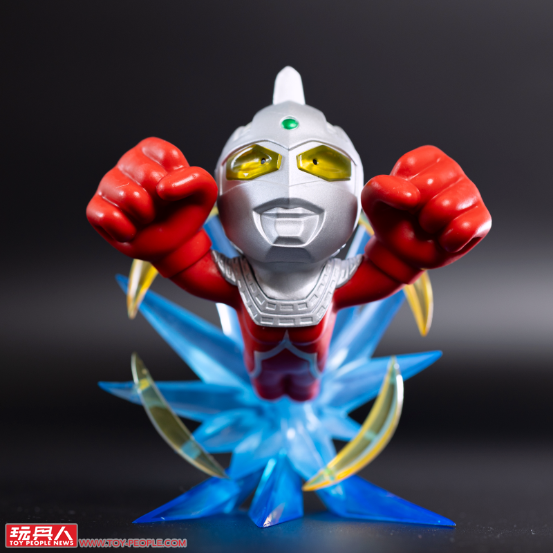 這次盒玩的規格大約落在 10 公分左右,並在這個精巧的尺寸中以透視感造型的力霸王本體、輔助搭配的特效件達成躍動感十足的變身瞬間,除了考究刻畫出每一位力霸王的造型細節之外,也因應每一位角色的特性做出了姿勢的差異,比方說超人七號是唯一舉起雙手的力霸王、握拳與張開手掌的不同......等,特效件部分則是在固定的造型中作出多種排列組合,增添整體的變化性;小編個人認為從上方 45° 往下看基本上會是最好的角度。