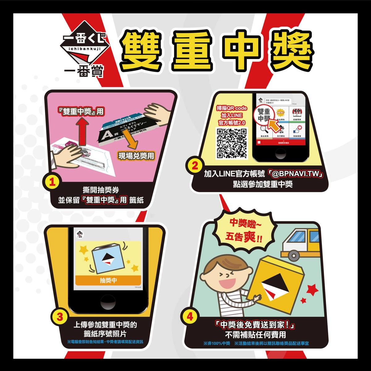 雙重中獎是『台灣代理版的獨家活動』讓您有多一次的中獎機會。打開一番賞籤紙時,除了印有抽中的獎項,另一面還有「雙重中獎用籤紙」!只要加入一番賞官方 LINE 帳號(BPNAVI.TW)並上傳「雙重中獎用籤紙」序號照片,就能立即查看抽獎結果!活動結束後還免費幫您送到家,不需要額外支付運費喔~