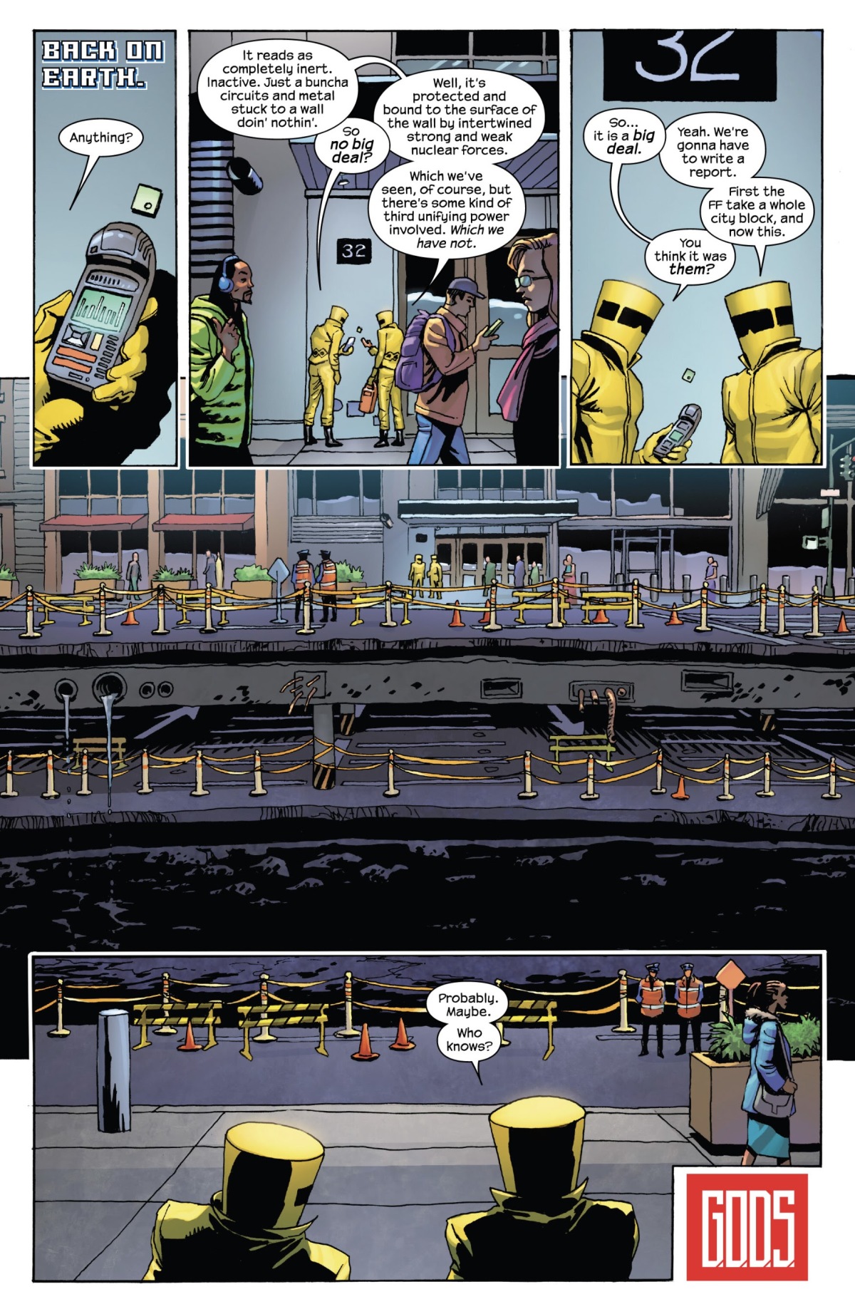 兩位超智機構(A.I.M.)科學家在紐約市看著地上的大坑洞,好奇著到底是誰造成這整個地區的消失;而他們首先懷疑的正是在連載初期被迫讓自己的家,巴克斯特大廈和旁邊整個街區消失的驚奇四超人。不過當然我們從先前的預告途中可以知道,罪魁禍首其實是入侵了地底下儲藏了Prometheus Pit的設施的Cubisk Core。