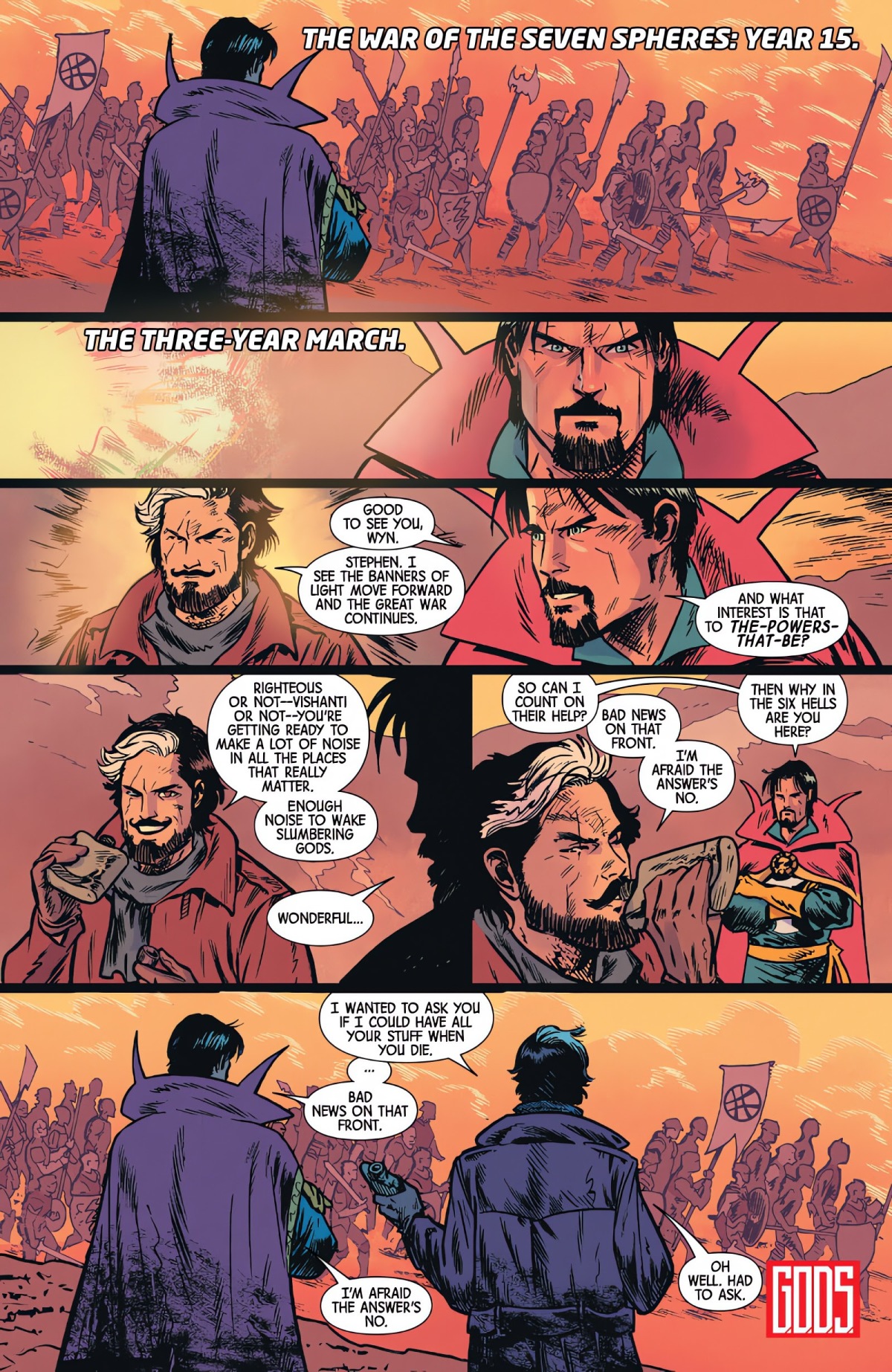 奇異博士這邊,則是當另一個他在回顧自己被迫加入維山帝(Vishanti)的行列,參與那場他打了三千年之久的「The War of the Seven Spheres」時,身為「將軍」的史傳奇遇到了Wyn,而對方特地跑來找他,只是想問他死後能不能把遺產都給自己XD