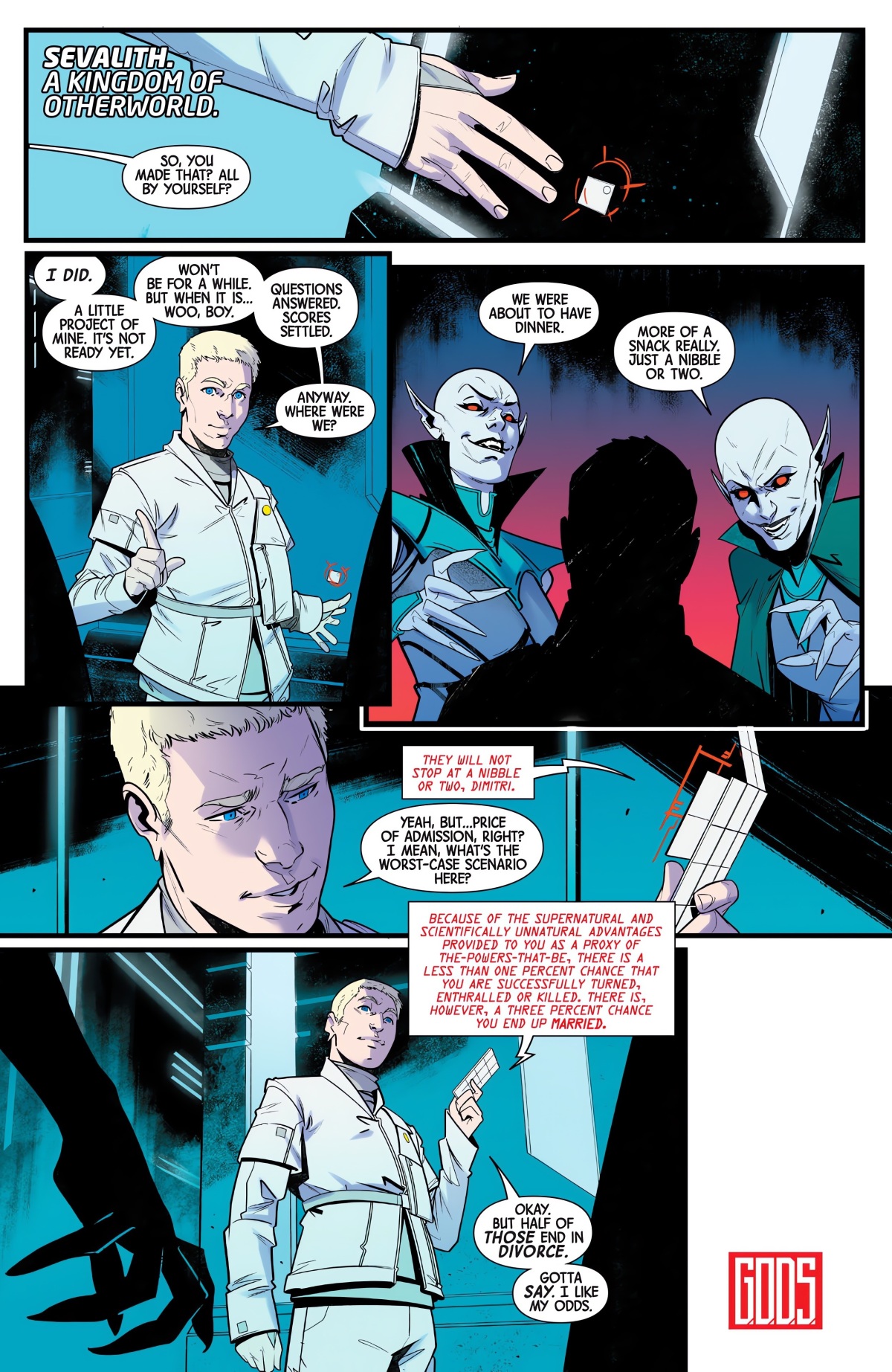 在緋紅女巫的連載這邊,則是與她完全無關的劇情。Dimitri來到了異界(Otherworld)十大王國之一的Sevalith,異世界吸血鬼的國度來與他們打交道。而由於他是「當權者(THE-POWERS-THAT-BE)」的使者,他可完全不怕這些吸血鬼。