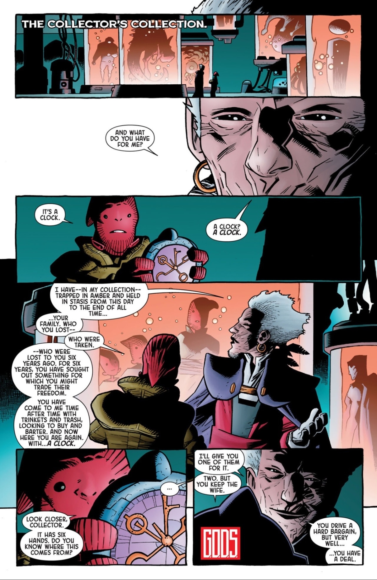 在銀河守護者這邊,則是某個家人被收藏者(The Collector)給抓了起來的倒楣鬼,這次找了個有六根指針的時鐘來跟他交換家人。但是為啥這個時鐘有那麼大的吸引力,讓收藏者願意拿兩個他的家人來跟他交換?