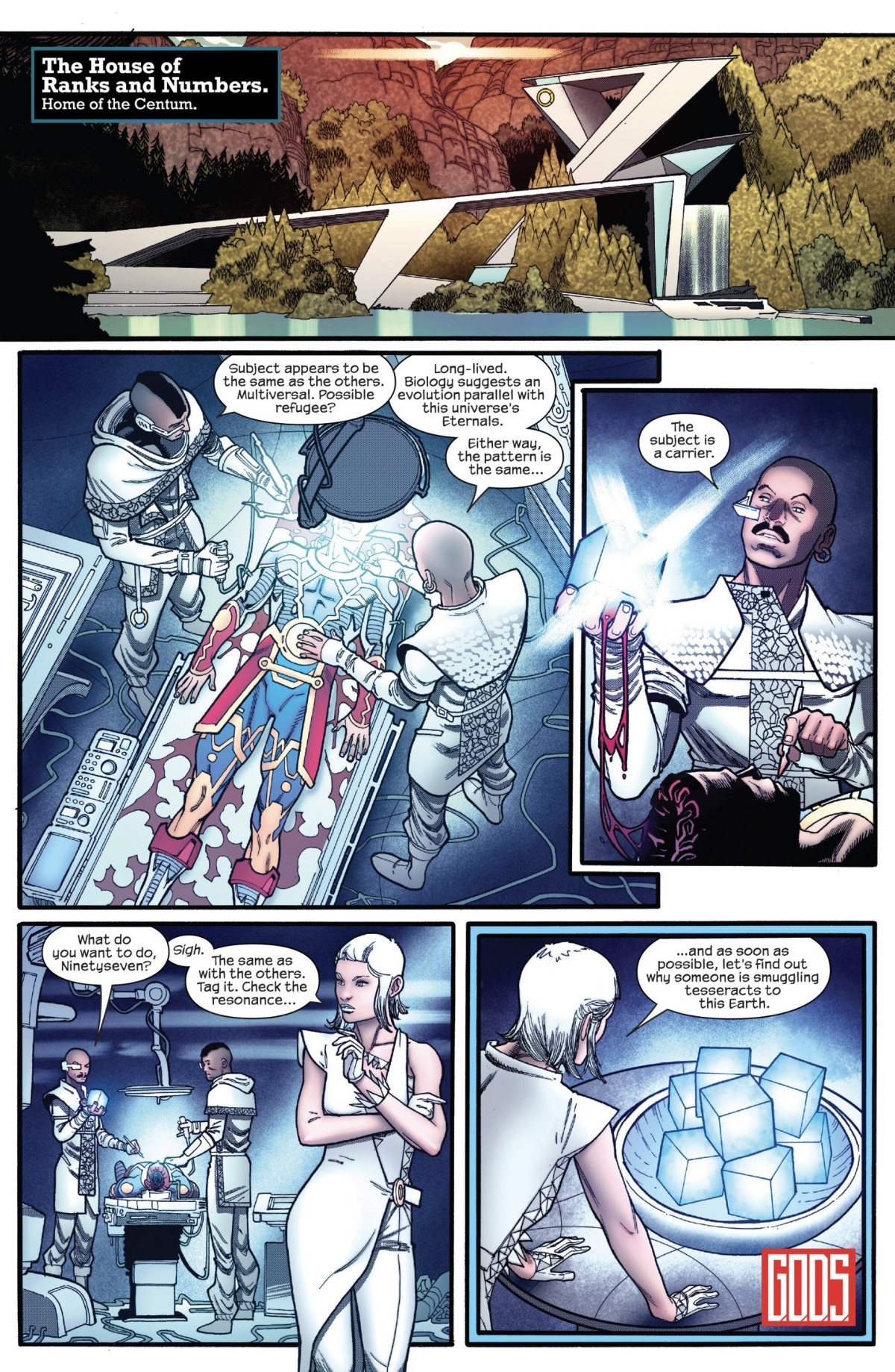 非凡復仇者這邊,則是鏡頭轉到了另一位角色Aiko Maki身上。在她所屬的「百人眾(The Centum)」這邊,他們正攔截了許多體內被裝進宇宙魔方(Tesseracts)的來自其他平行宇宙的永恆族(Eternals)屍體。這到底是誰在搞鬼?