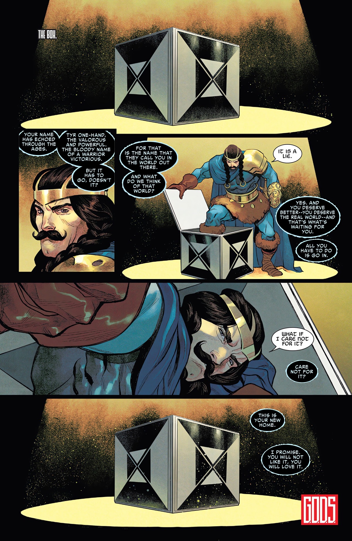 到了索爾新連載這邊,則是神話中索爾的兄弟,現在一直站在冥神海拉(Hela)這邊的戰神提爾(Tyr),被不明來源的聲音哄騙,走進了一個盒子裡面待著。雖然無法確定,但是看對話內容和框,對方應該是Cubisk Core。