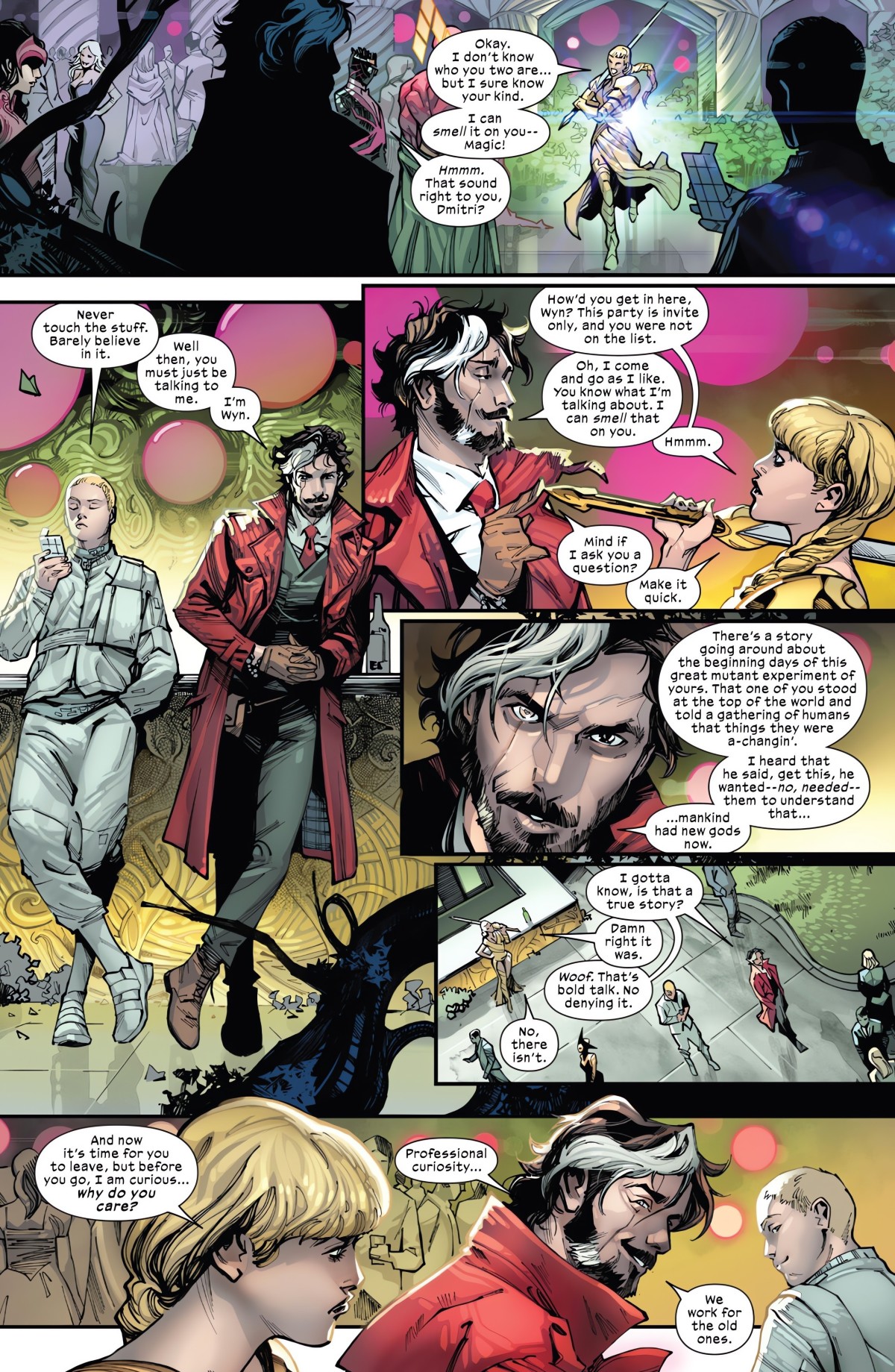 首先是在Gala舉辦到一半時,擔任守衛的Magik發現了同樣身為魔法師的Wyn,於是試圖把他和他的同伴Dimitri the Science Boy給趕出去。Wyn欣然同意離開,但是在走之前還是稍微跟她瞎扯了一下。算是Hickman新作品的角色跟前作的角色打個招呼的故事吧。